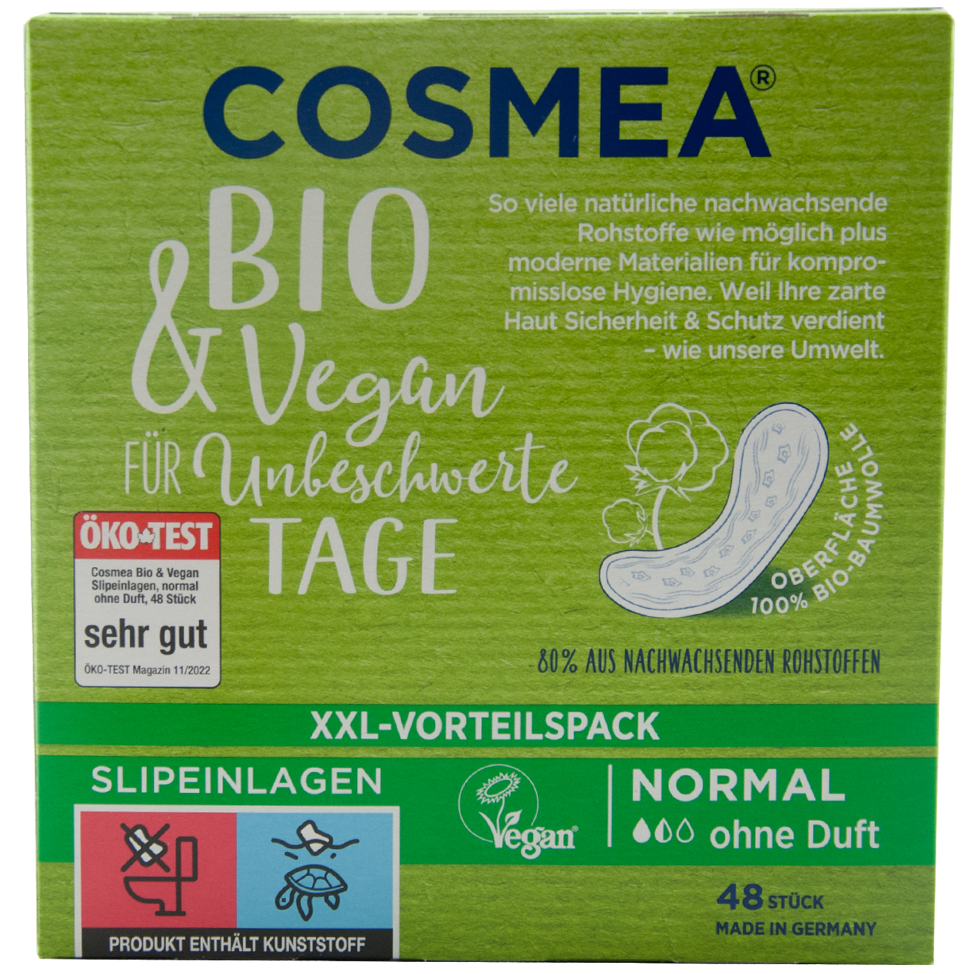 Die COSMEA® Bio-Slipeinlagen normal werden mit einer Oberfläche aus 100% zertifizierter Bio-Baumwolle und einem Saugkern aus chlorfrei gebleichten Naturfasern hergestellt. Der Wäscheschutz ist natürlich ohne Plastikfolie und 100% luftdurchlässig – höchster Tragekomfort bei verantwortungsvollem Umgang mit Ressourcen!