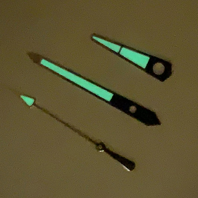 l These watch hands have green luminous effects, which can make them glow at night or at the dark places