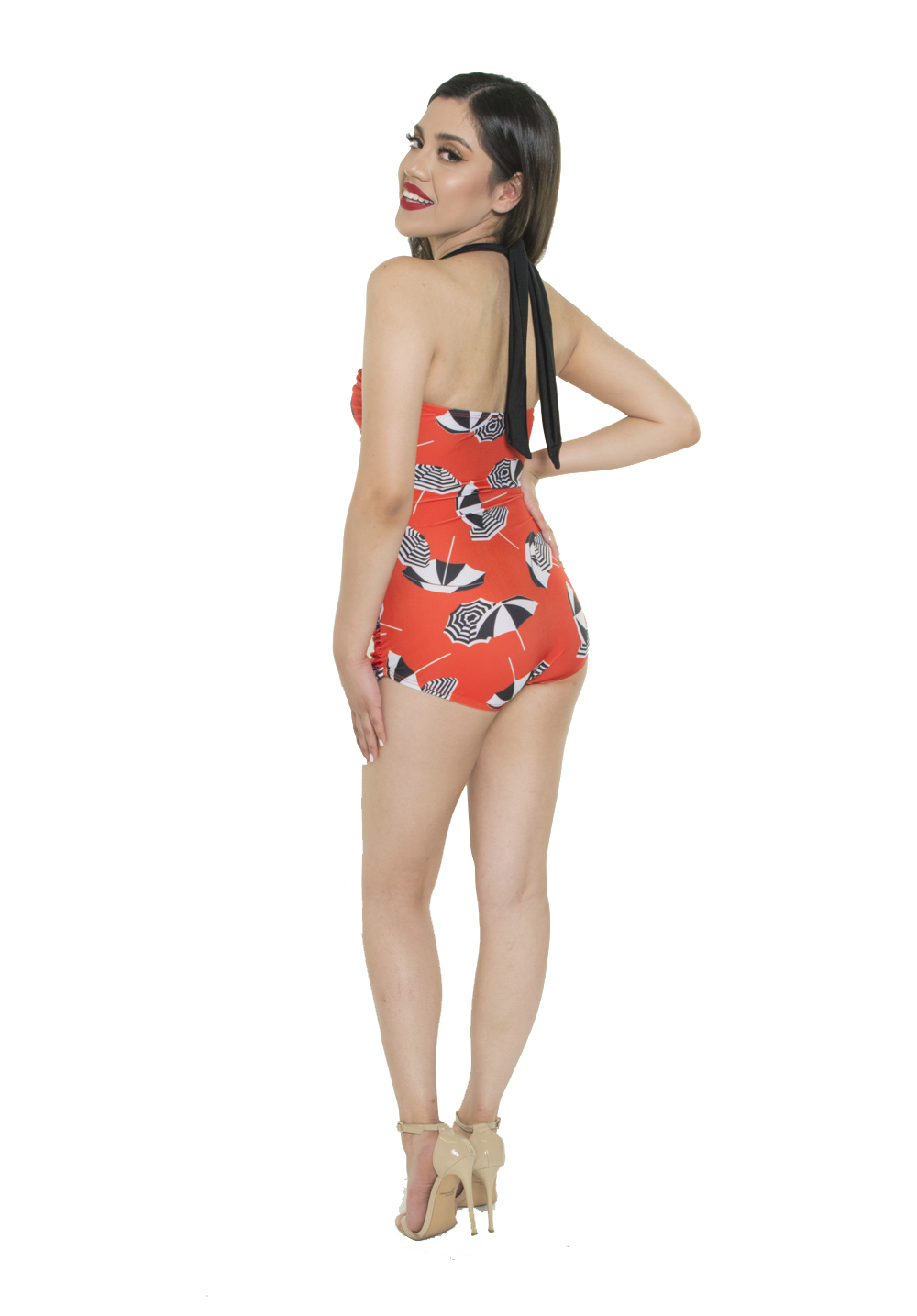 ?Girl Howdy Swimsuit One Piece Sheath Vintage Style Red Black Umbrella Print