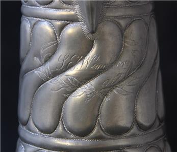 The stein features three feet with angel faces and repousse-embossed body design that copies the one from 17th c-18th century shapes. The front of the stein is engraved with the laurel wreath and the original owner's name: "S.E.Windker".
