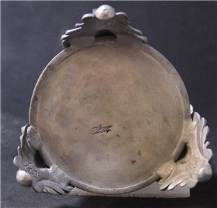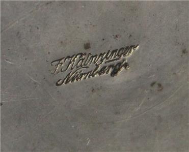 The stein was manufactured by Franz Kainzinger - a pewter manufacturer from Nuremberg active in the 1870s - 1910s. Stamped at the bottom with "F.Kainzinger Nuernberg" manufacturer's mark and "F.K.1672" on the feet, indicating the stein was modeled after a pewter flagon from 1672.