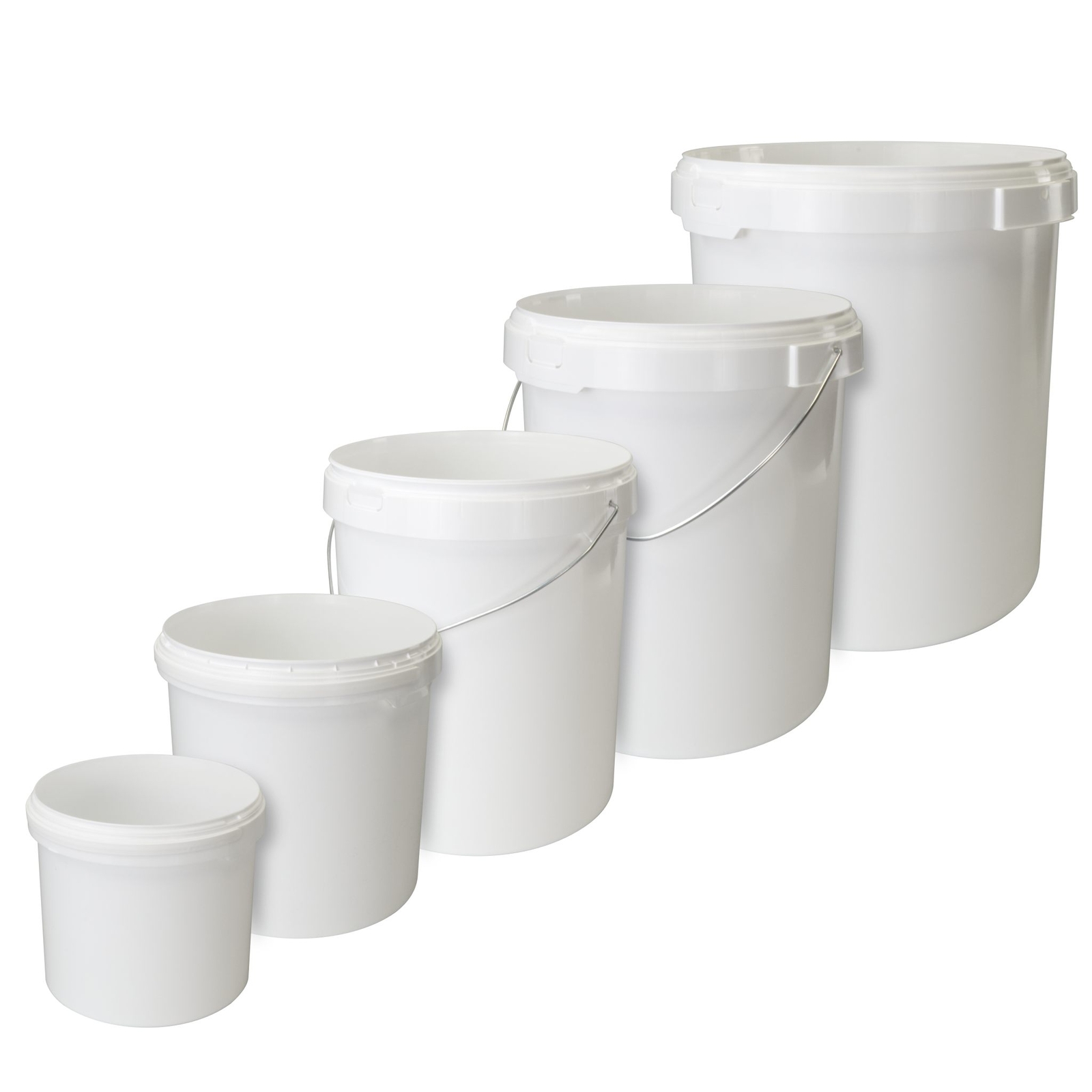 Rundeimer mit Deckel und Bügel*. Aus Polypropylen, weiß. 5-30 Liter Füllmenge. Stapelbar. Lebensmittelfreigabe. Die Eimer zeichen sich durch Ihre gute Qualität aus, und werden in den Niederlanden hergestellt.