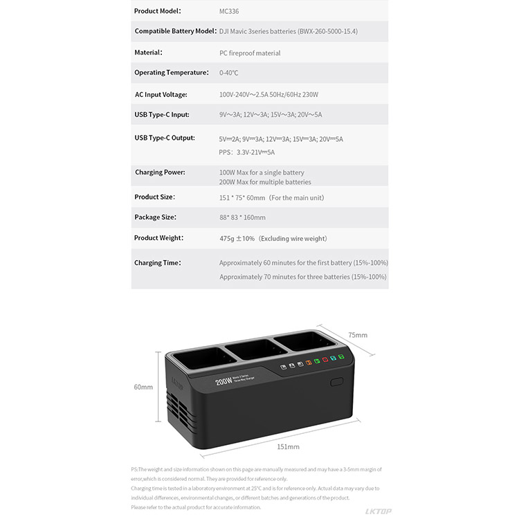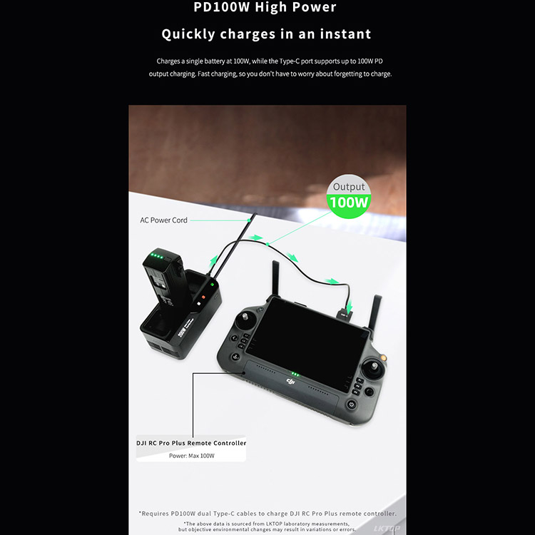 l Charges a single battery at 100W, while the Type-C port supports up to 100W PD output charging. Fast charging, so you don't have to worry about forgetting to charge