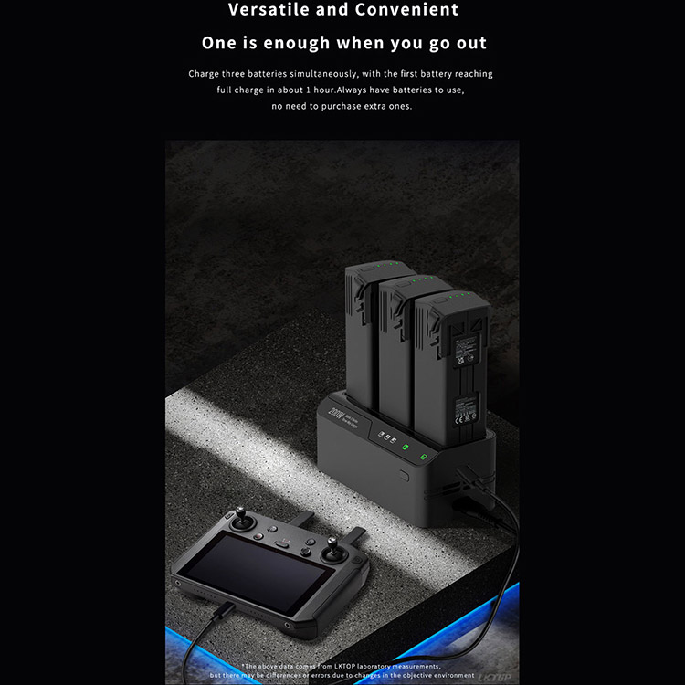 l Versatile and Convenient. One is enough when you go out. Charge three batteries simultaneously, with the first battery reaching full charge in about 1 hour