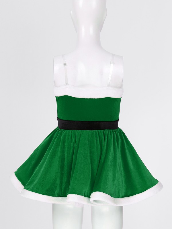 Women Christmas Theme Party Costume Adjustable Transparent Strap Faux Fur Trim Layered Flared Dress.