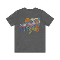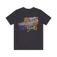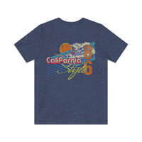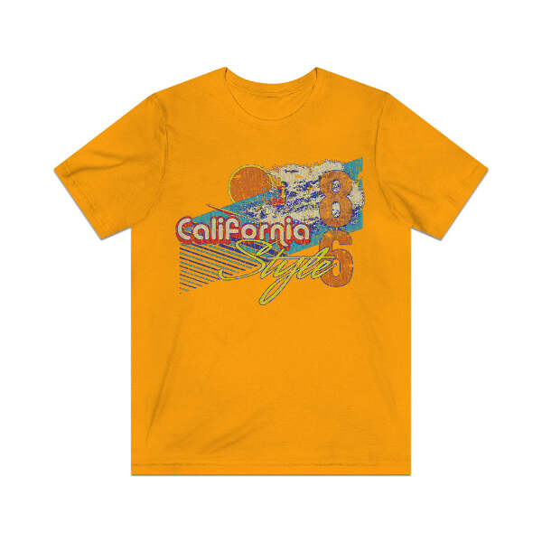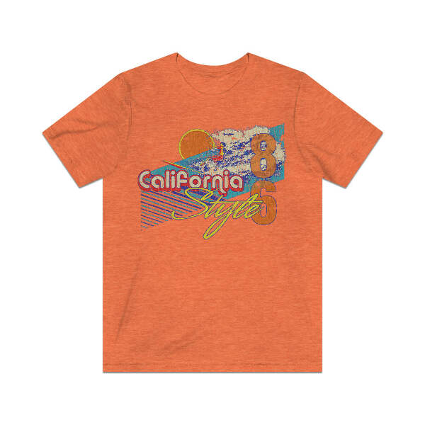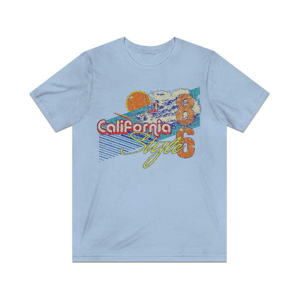 The '80s weren't all neon ridiculousness... there was a whole casual California surfer theme that became quite popular, primarily through graphic t-shirts and patterned Hawaiian style shirts. This mid '80s inspired design captures the vibe of the era.