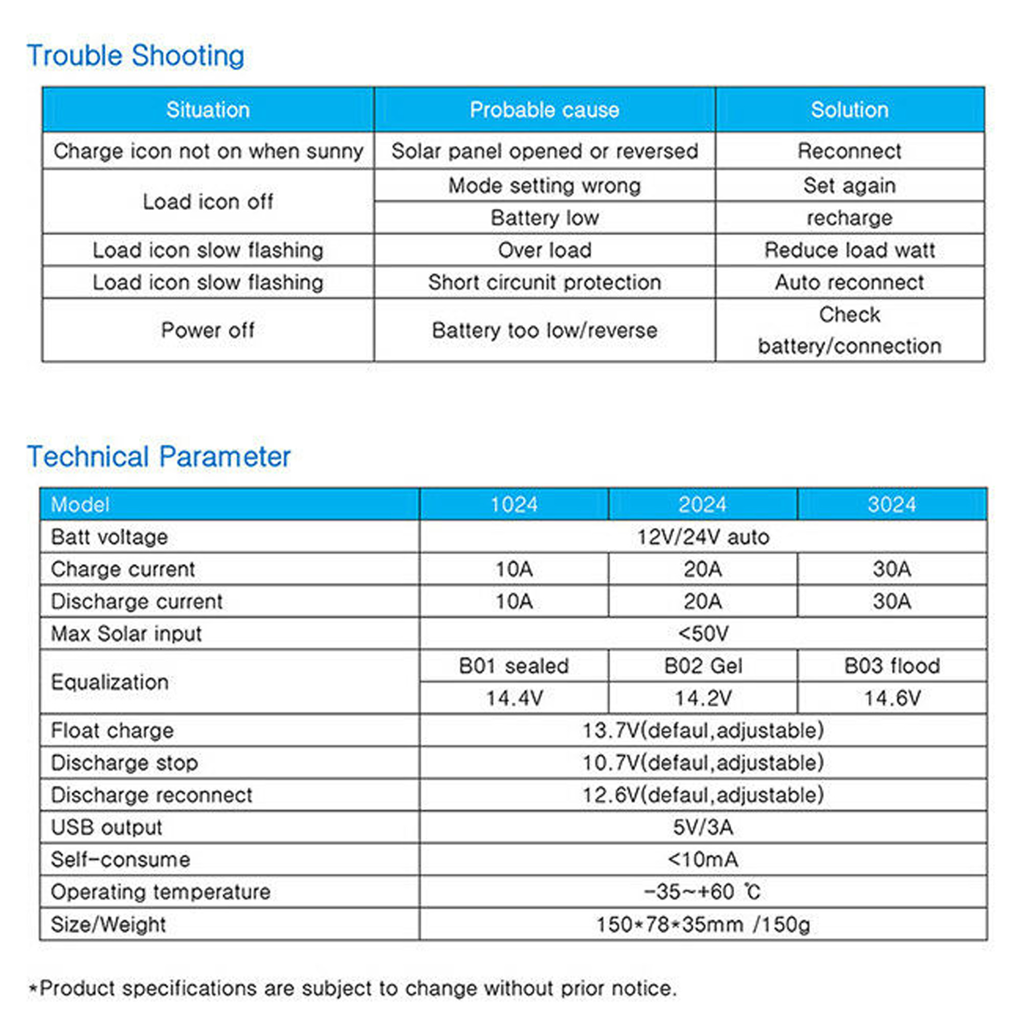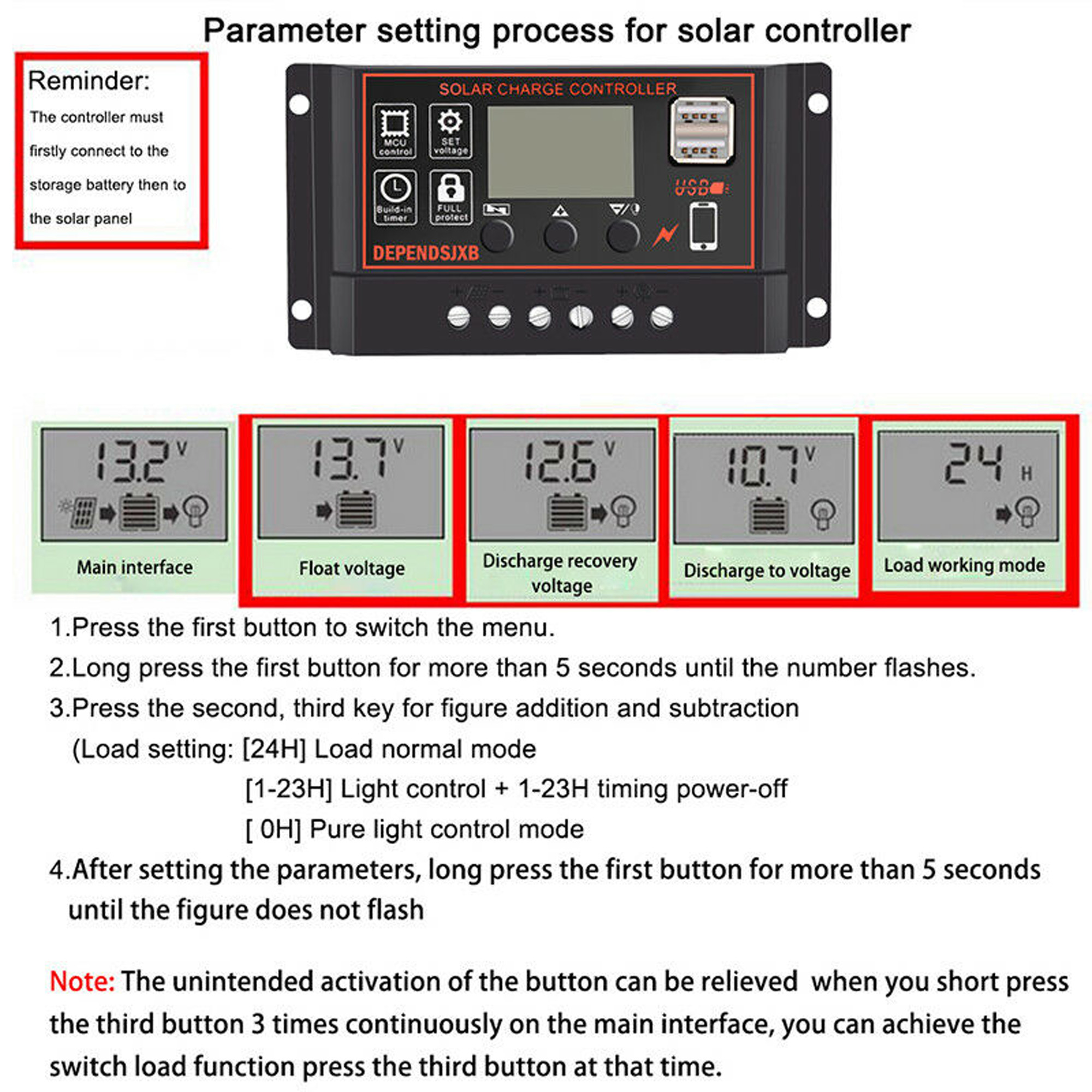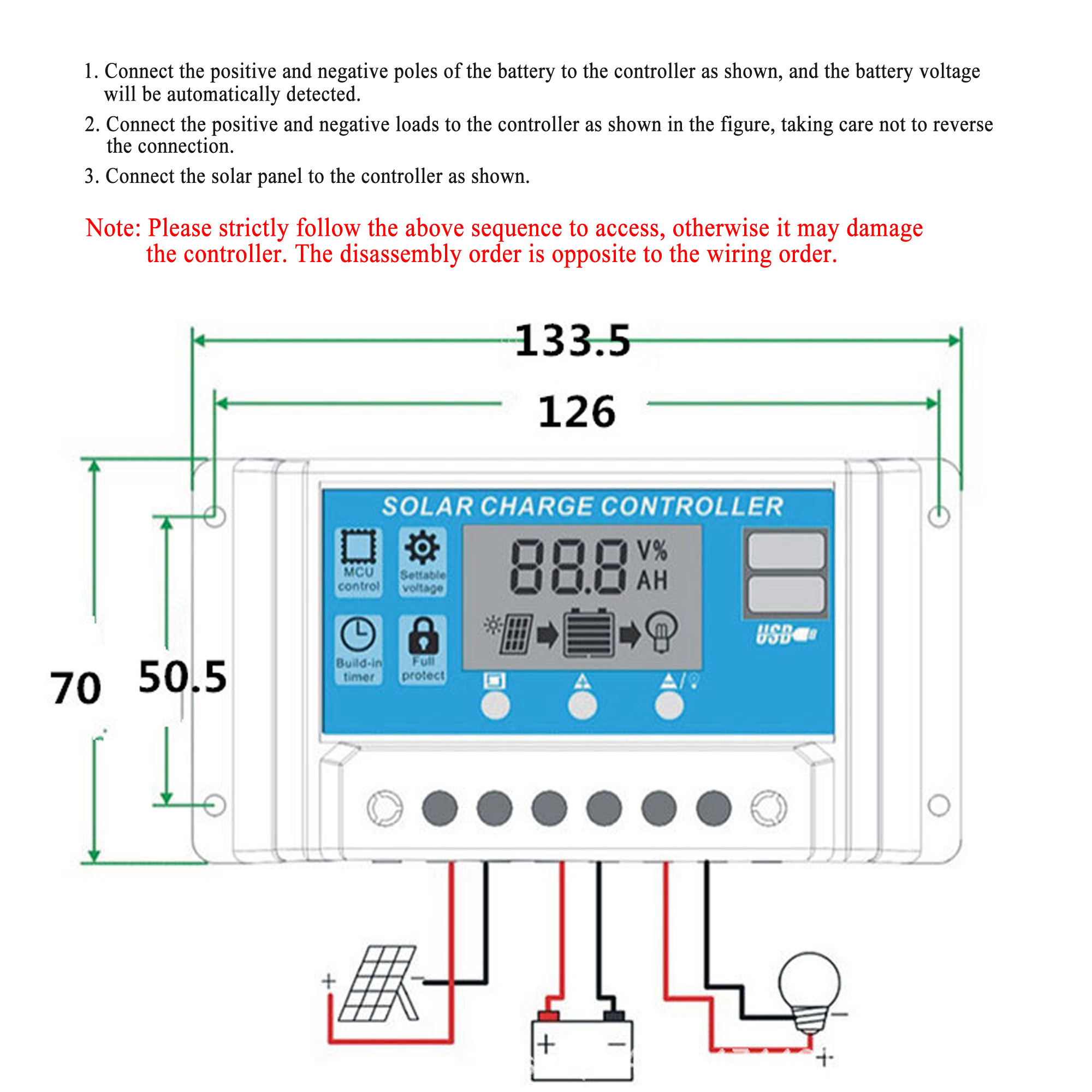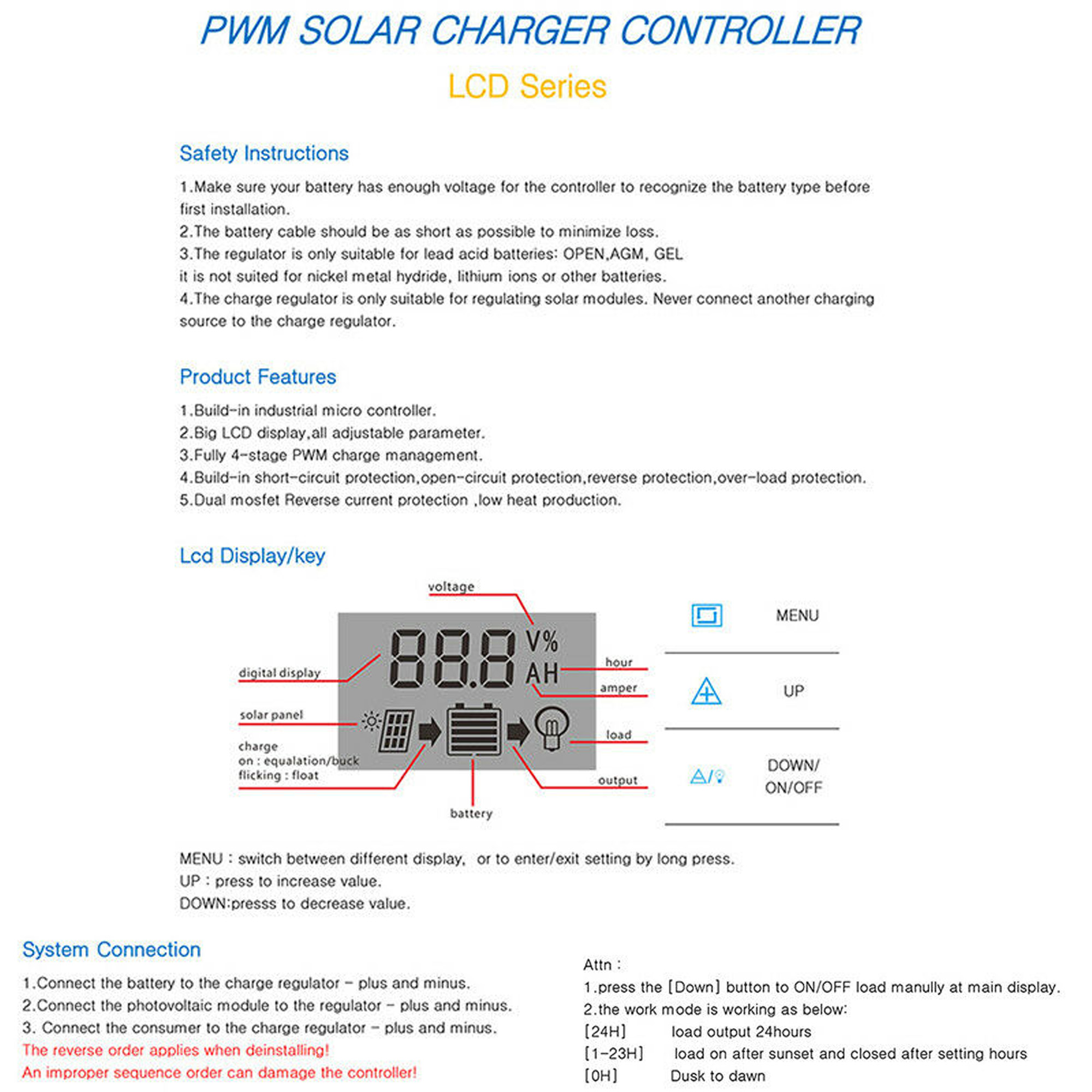 1. The controller is a 12V / 24V lead-acid battery-automatic adaptation. When installing for the first time, please ensure that the battery has sufficient voltage so that the controller can recognize the correct battery type.
