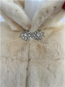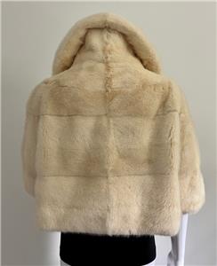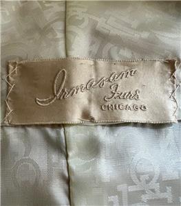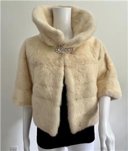 Old time Hollywood glamor comes to mind for this lovely cream fur crop jacket from Irmasan Furs of Chicago - beautifully made with wide collar, 3/4 sleeves and gorgeous crystal jewel at neckline for closure as well as hidden large eye hooks - single inner pocket on right side with "Fur Label Authority" tag inside, wonderful piece.