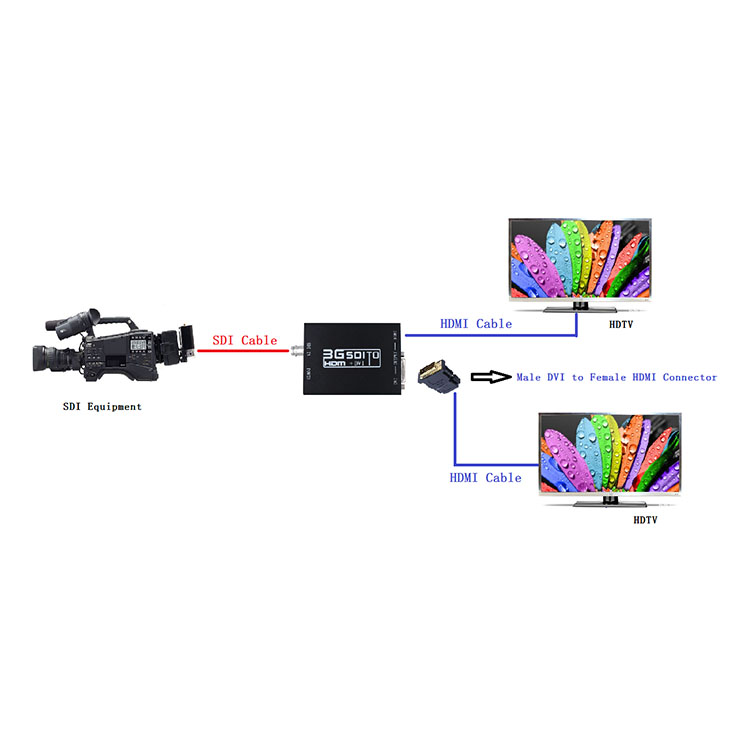 l The SDI to HDMI+DVI converter allows SD-SDI, HD-SDI and 3G-SDI signals to be shown on HDMI and DVI displays while ensuring high bit rates of 2.970 Gbit/s to give you fast signal transmission without any loss