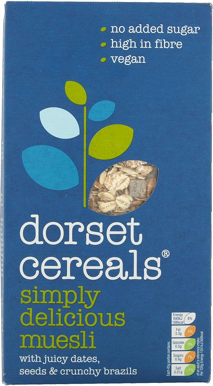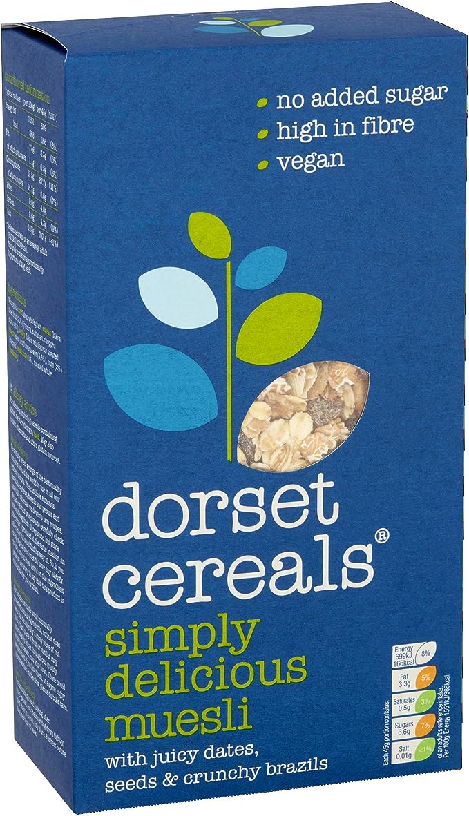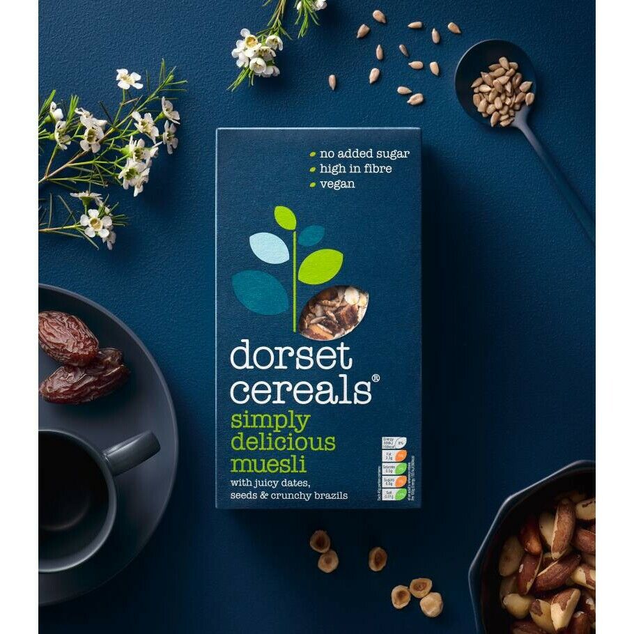 Simply Delicious Muesli is a scrumptious blend of raisins including juicy jumbo Chilean flame raisins, sunflower seeds, dates, roasted hazelnuts and brazil nuts with multi-grain flakes. With juicy dates, seeds & crunchy Brazils. Contains wholegrains. High in fibre. No added sugar (contains naturally occurring sugars). No added colours or preservatives. No artificial flavours. Suitable for vegans. Vegetarian Society Approved. Kosher - KLBD.Breakfast on the slow From Sandbanks down to Durdle Door, Dorset's a place where things go at a slightly slower pace. And despite all the haste and hurry in life, we believe in a calm moment of pleasure at the start of the day. So why not breathe in the morning air, listen to the radio and sit down to enjoy a generous bowl of our delicious muesli. We call it Breakfast on the Slow.