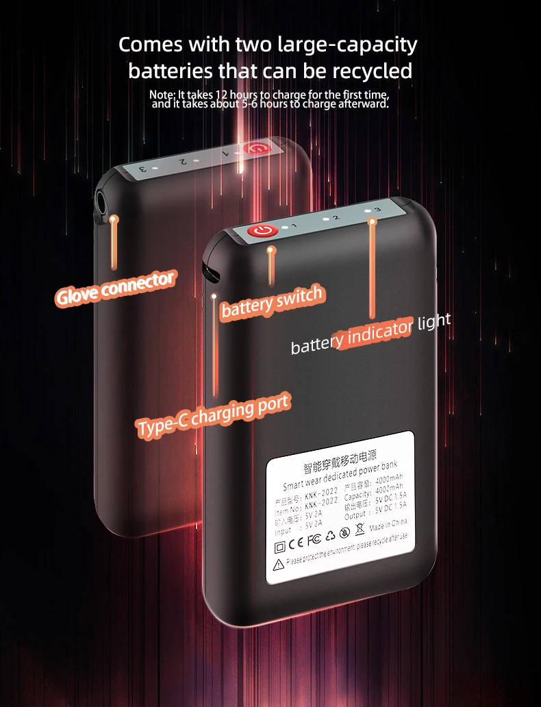 3 Put the lithium battery into the pocket of the glove where the battery is placed, close the zipper, put on the glove, and press the three-speed thermostat to use.