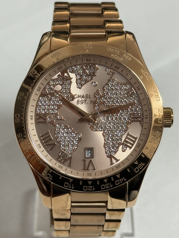 Watch Information: Gender: Women Case Size: 44mm Dial Color: Rose Gold Material Case: Stainless steel Material Band: Stainless Steel Diamonds: n/a Movement: Analog Quartz Water Resist: 100 Meters Water Resistant Features: Date, Chronograph Clasp/Buckle: Deployment Buckle Additional Info: Packaging: Michael Kors Box & Papers
