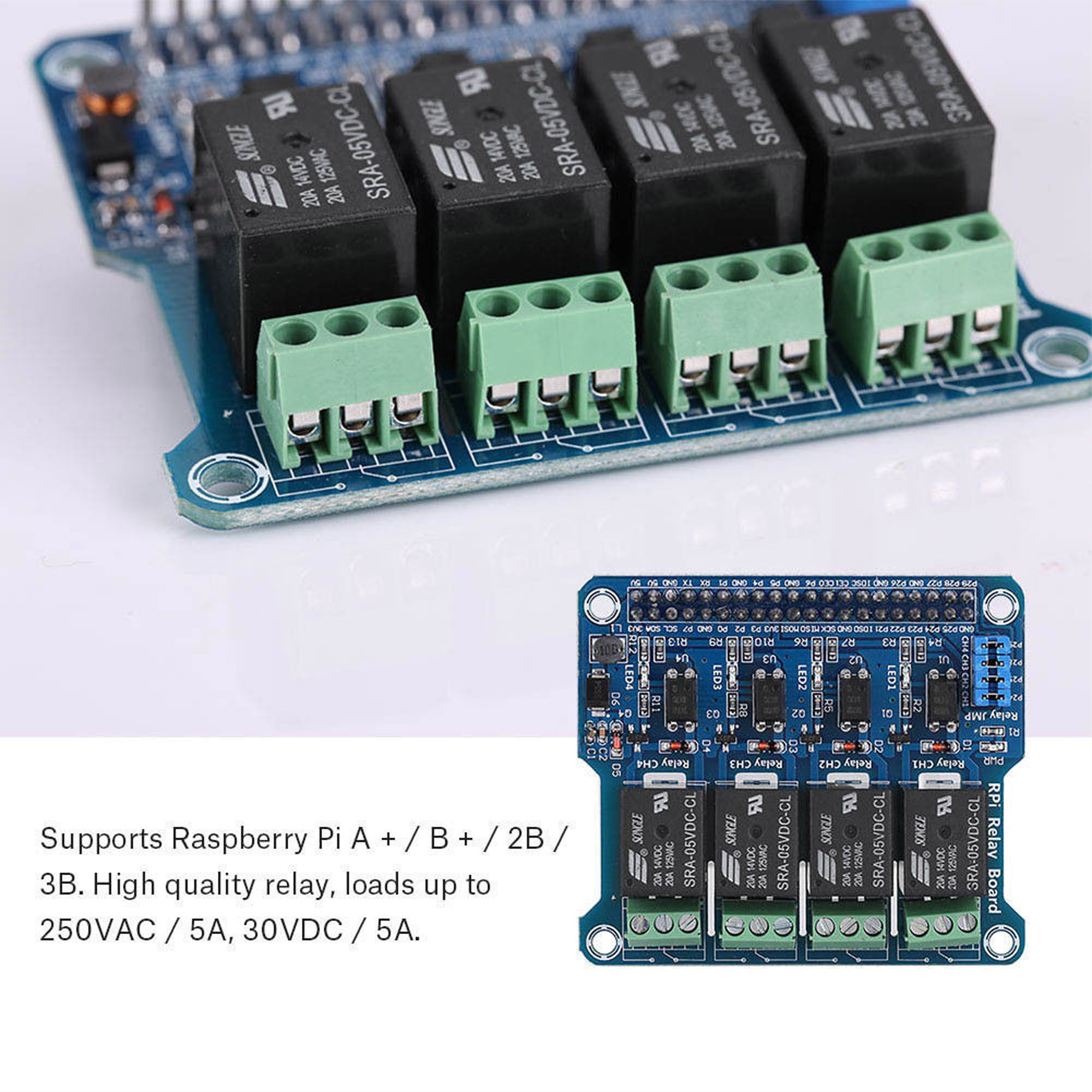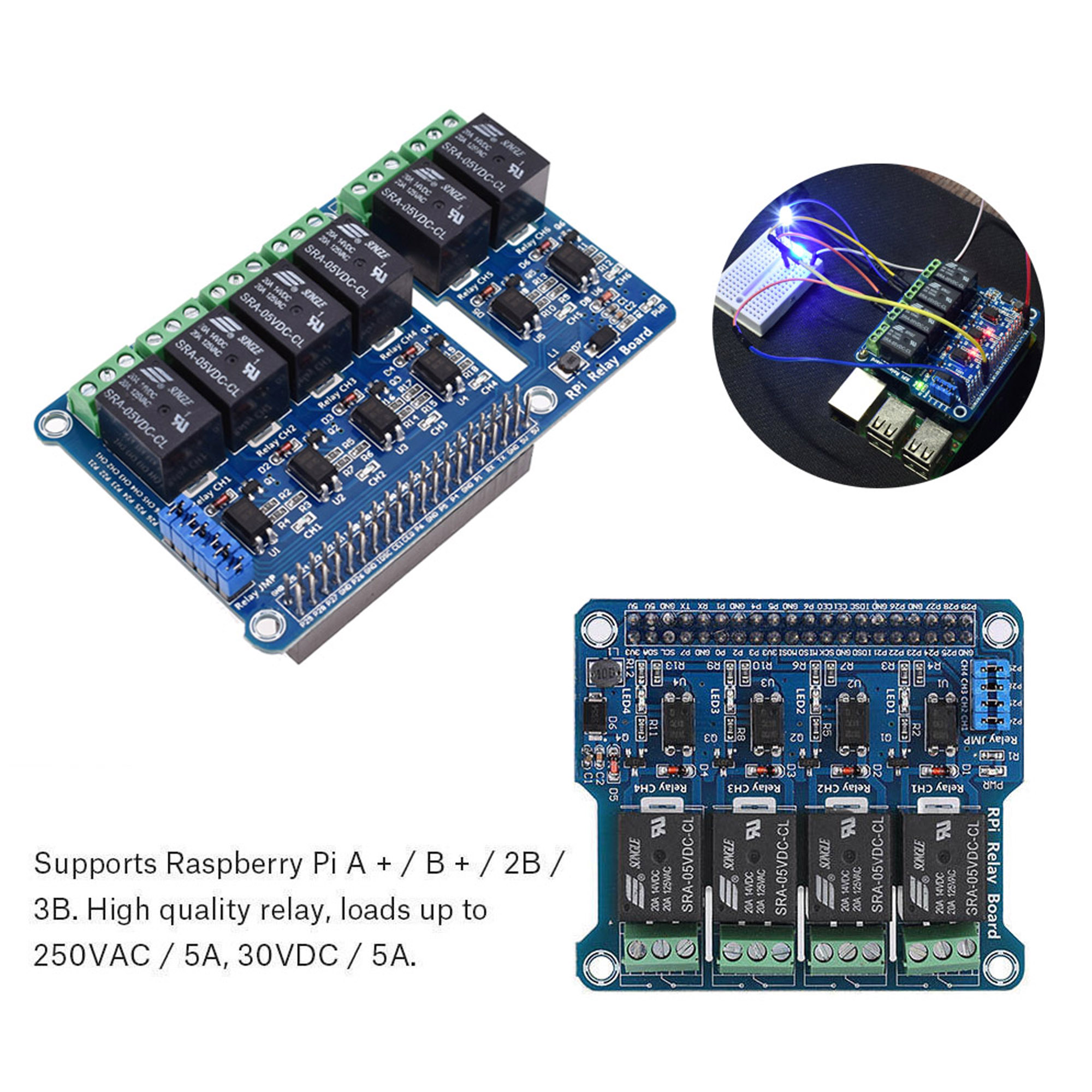 Supports Raspberry Pi A + / B + / 2B / 3B. High quality relay, loads up to 250VAC / 5A, 30VDC / 5A.