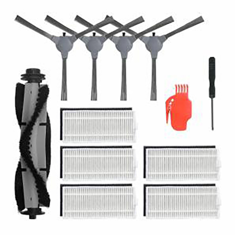 1 roller brush + 4 side brushes + 5 filters + 1 red brush + 1 screwdriver