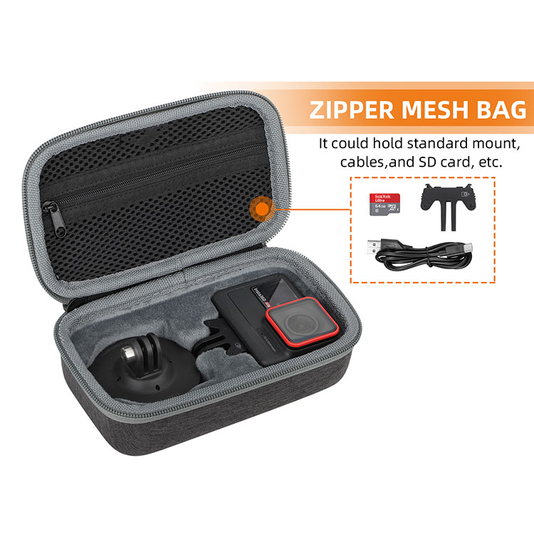 l Stores Insta360 Ace or Ace Pro, quick release base, adhesive base, battery, and accessories such as charging cable and memory card