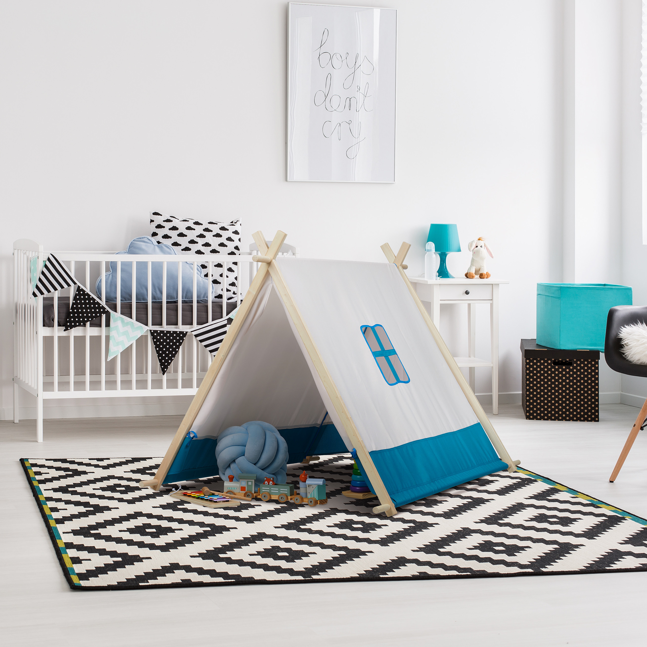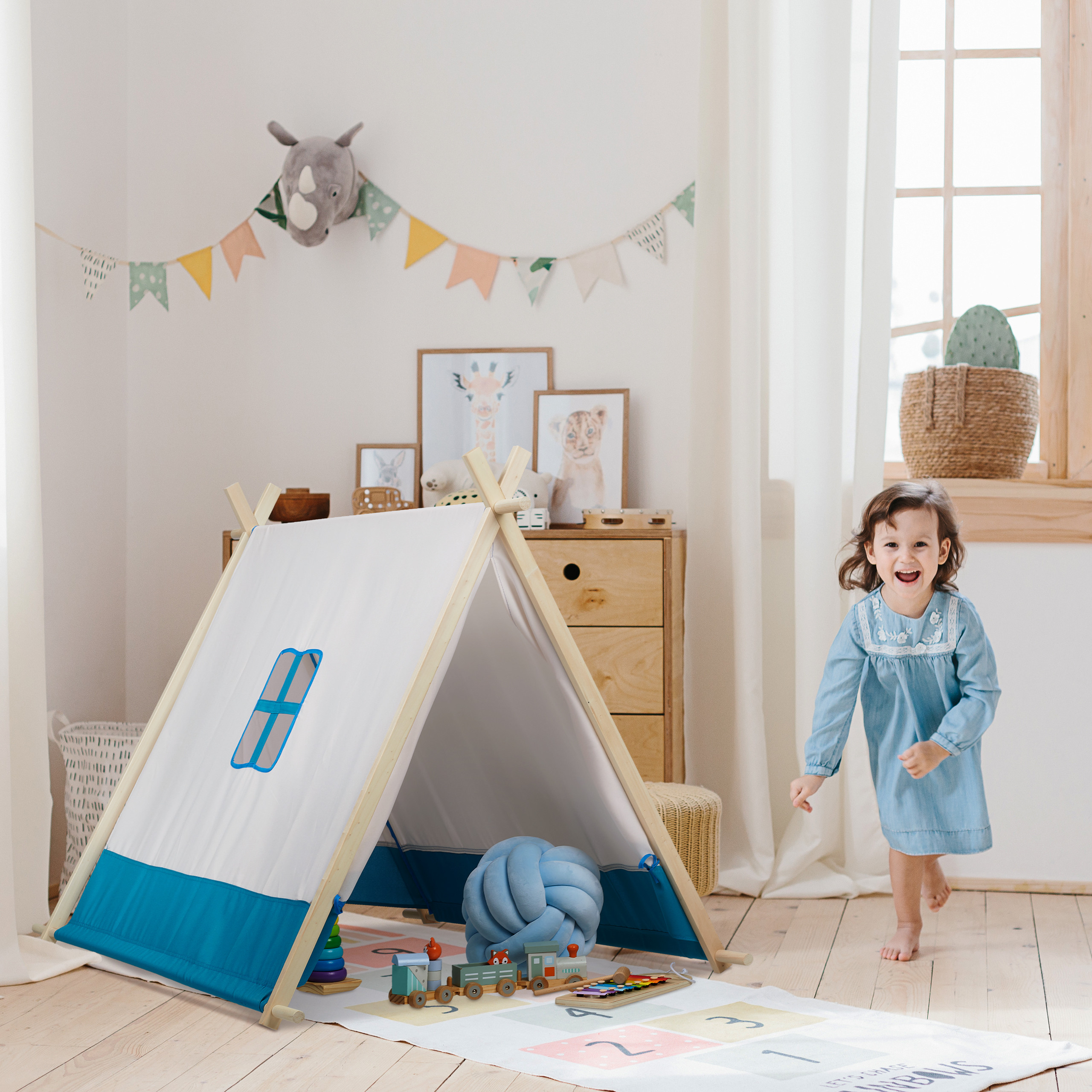 Dieses coole Tipi Zelt ist der perfekte Rückzugsort für Kinder. Das Kindertipi in Weiß-Blau ist mit seinem flachen Design und dem kleinen Fenster ein echter Hingucker in jedem Kinderzimmer. Für Deine Kleinen bietet das Kinderwigwam kreativen und ausgelassenen Spielspaß. Durch die große Öffnung auf der Vorderseite können die Kleinen bequem rein- und rauskrabbeln oder es sich einfach im Inneren gemütlich machen. Das Spielzelt besteht aus robustem Stoff und einem stabilen Gestänge aus Holz.