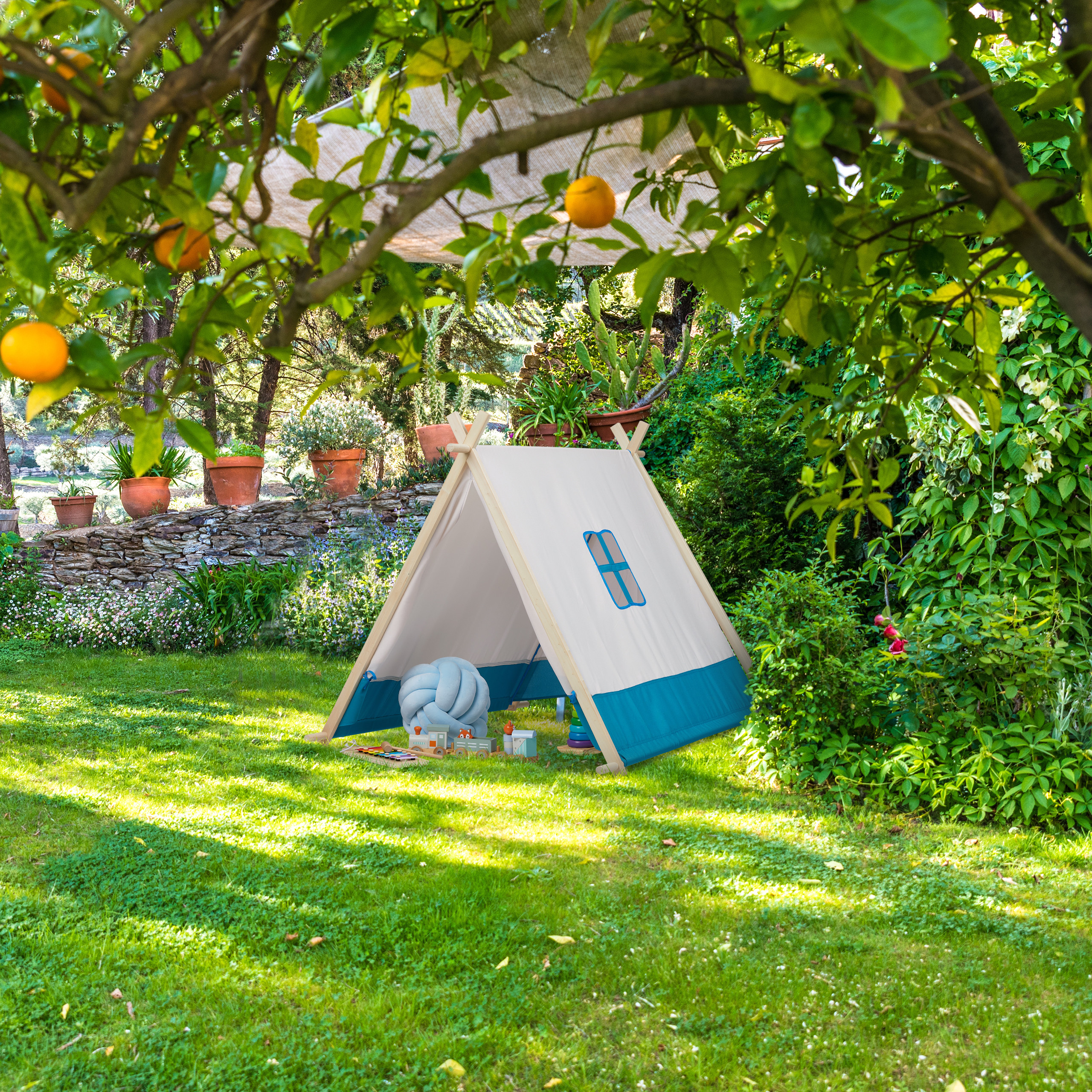 - Bei schönem Wetter das Tipi in den Garten stellen
