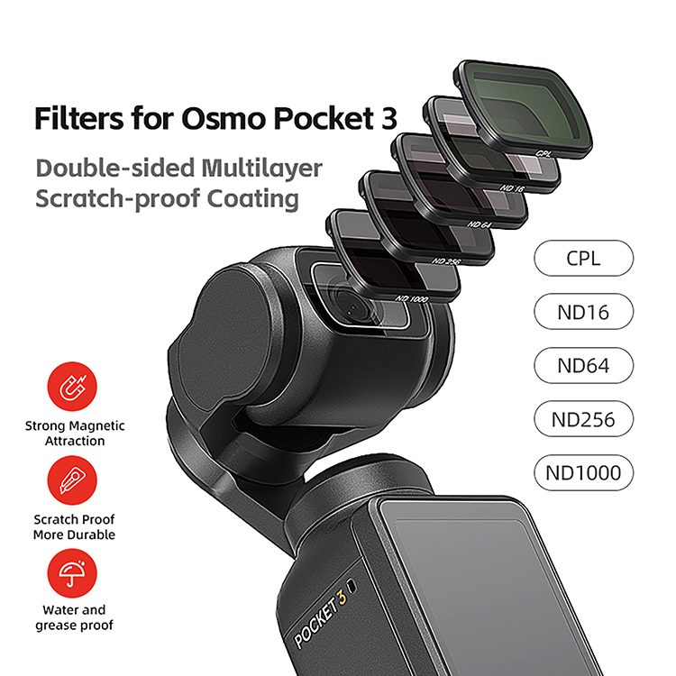 l The filter is as thin as 2.2mm, which ensures the free rotation of the axle lock of Pocket 3. You can turn off the Pocket 3 without removing the filter