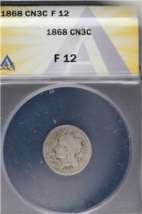 Up for auction is a 1868 Three Cent Nickel. This coin is circulated and is graded F12 by ANACS. The coin pictured is the one that you will receive. Sorry, but no international shipping. Each additional item ships for $1.00 if paid for in the same payment. Your order will be shipped with 2-3 days of payment. Thanks for looking and make sure to check out my other listings.