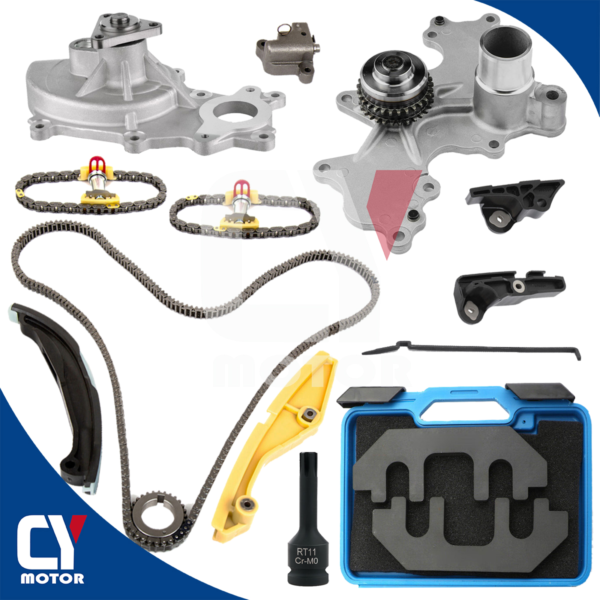 Water Pump With Gasket - 3-Bolt Flange X 1 PCSHerramientas De Distribucion / Timing Tool Set:567618 Ford Camshaft Holding Tool X 2 PCS567619 Ford Chain Tensioner Hold Down Tool X 1 PCSRT11 Bolt Removal Socket X 1 PCS