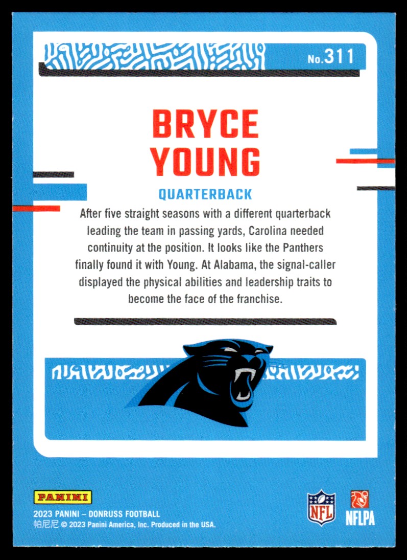 | 2023 Donruss Rated Rookie Bryce Young Rookie Carolina Panthers #311 |