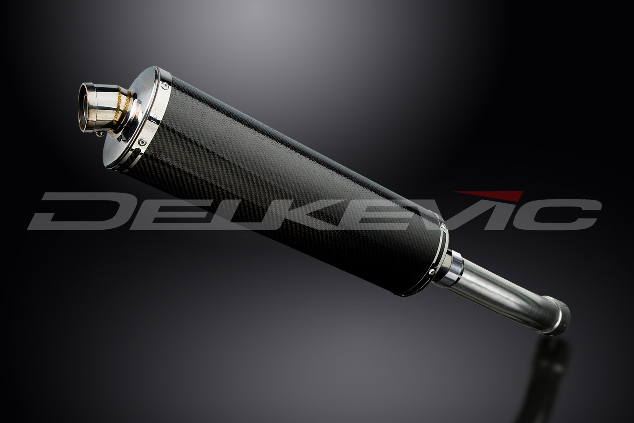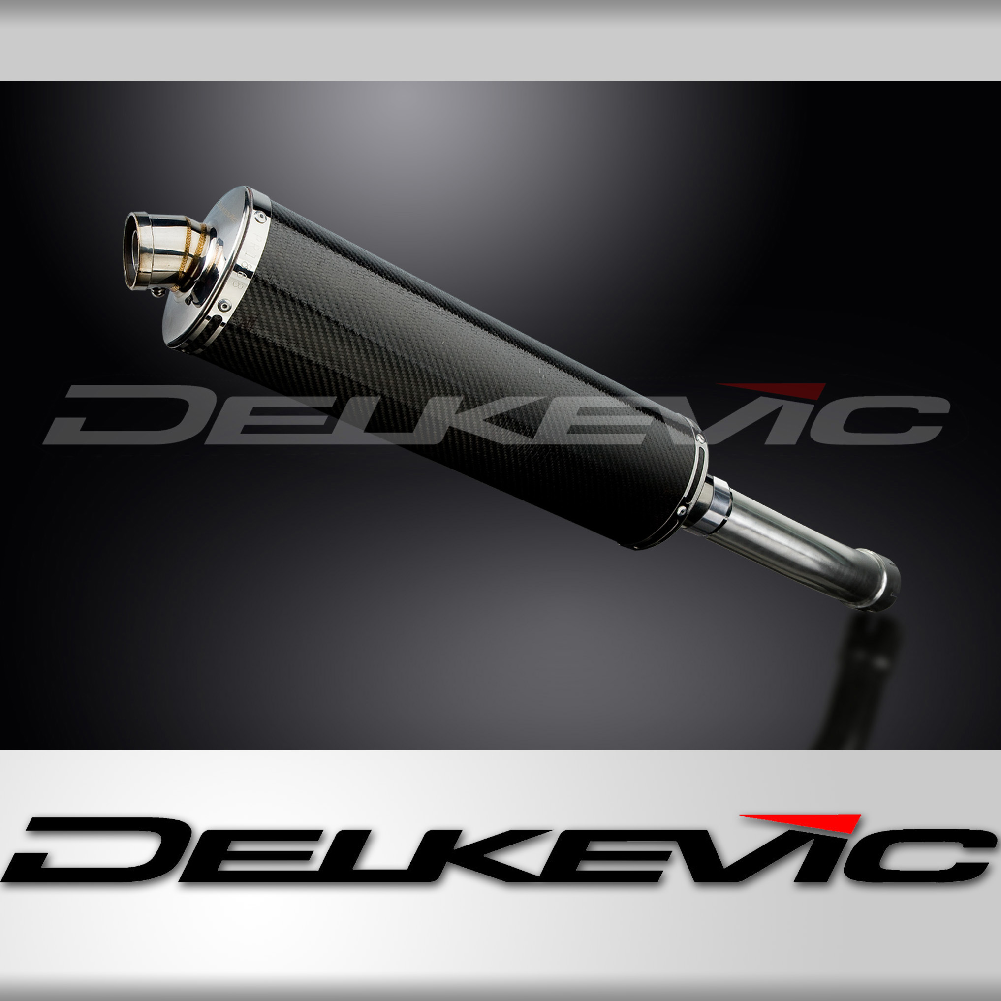 Delkevic 18" oval carbon fiber mufflers are made from a pre-formed composite carbon fiber sleeve and high grade 304 stainless polished to a mirror finish. With all hand welded parts and careful attention to detail, they have a deeper sound even at higher revs.