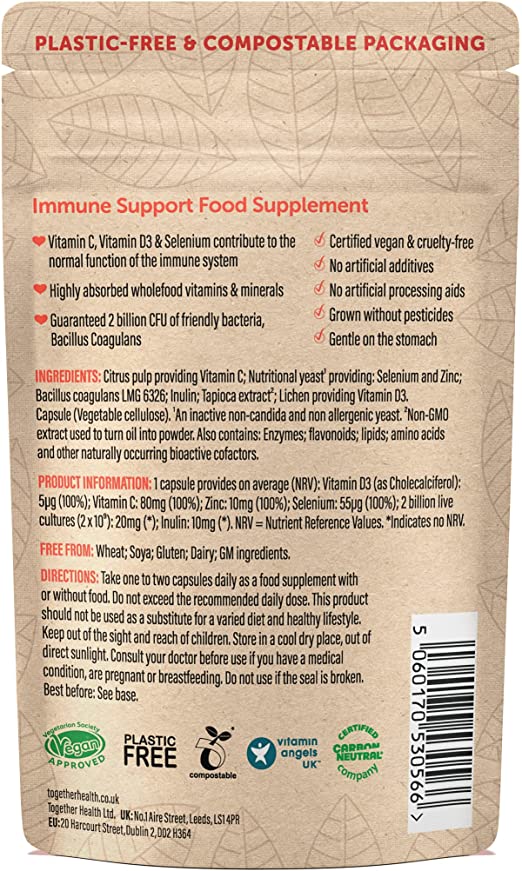 Together's unique immune supplement is designed to give your body a helping hand whether you're fighting off a cold, feeling a bit groggy, or in the middle of something stressful. This immune system power boost comes with all the benefits of Together's vitamin C, selenium, zinc, and vitamin D supplements, along with the hardiest strain of live bacteria highly studied for its immune benefits. Our bodies are able to absorb vitamin C best when it's in a whole food complex, complete with naturally occurring bioflavonoids. These bioflavonoids help with vitamin C absorption and also have their own health properties, such as supporting healthy blood circulation and treating allergies. Key highlights: Whole food nutrients Naturally occurring bioflavonoids from whole citrus fruits Immune specific strain of the strongest good bacteria in the world Guaranteed 2 billion CFU at the end of shelf life Complete nutrients Highly Absorbed Gentle on the stomach Raw ingredients Tested pesticide free Natural food cofactors Free from additives and processing chemicals Non GMO Handy resealable pouch Made in the UK Vegan Special notes: 100% plant based vegecap may be split and powder mixed with food or drink Minimum 12 month shelf life at purchase, once opened 2 months in the original resealable packaging Does not contain... Wheat; live yeast; starch; gluten; milk products (lactose); soya; added sugars; additives; colourings; flavourings; preservatives and GM ingredients.