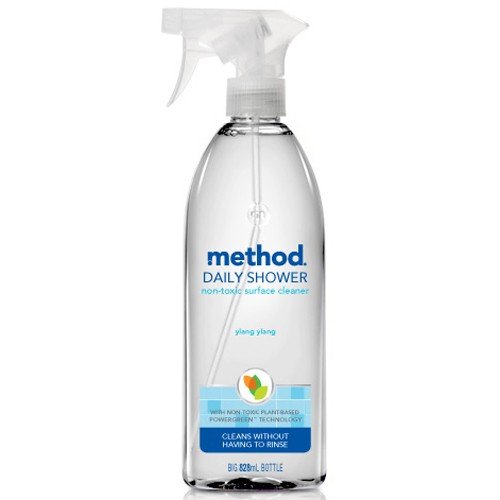 Method Daily Shower Surface Cleaner with ylang-ylang fragrance and powergreen technology give your grout-scrubbing arm a break. The naturally derived, non-toxic and biodegradable ingredients in our daily shower spray. Simply spray post-shower and the fine mist prevents soap scum and lime deposits. It smells like a spa. With daily shower spray, you will never have to scrub, wipe or rinse your shower again, just spray a fine mist on all wet surfaces after each shower. Its powergreen technology is cutting-edge green chemistry that harnesses the strength of naturally derived, non-toxic ingredients to deliver a mighty cleaning punch. Available in 828 ml bottle.