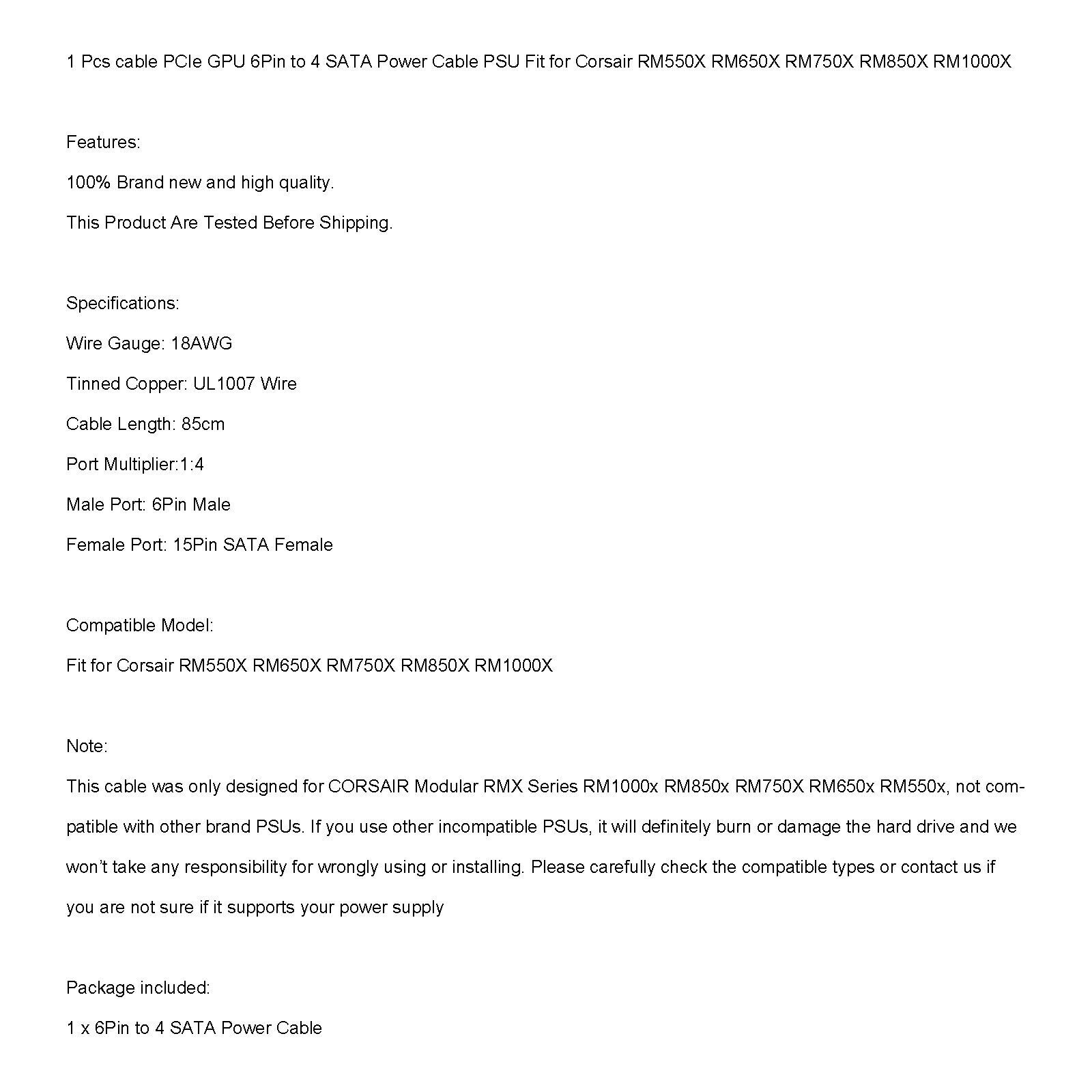 This cable was only designed for CORSAIR Modular RMX Series RM1000x RM850x RM750X RM650x RM550x, not compatible with other brand PSUs. If you use other incompatible PSUs, it will definitely burn or damage the hard drive and we won’t take any responsibility for wrongly using or installing. Please carefully check the compatible types or contact us if you are not sure if it supports your power supply