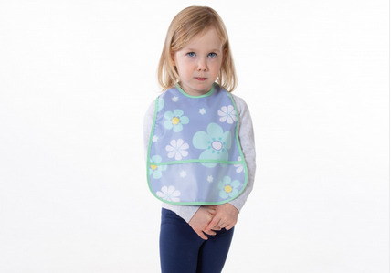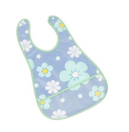 This "wipeable" plastic-coated bib features a pocket to catch spilled