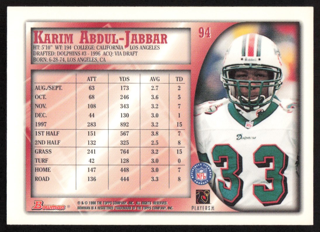 1998 Bowman Football Karim Abdul-Jabbar #94 Miami Dolphins