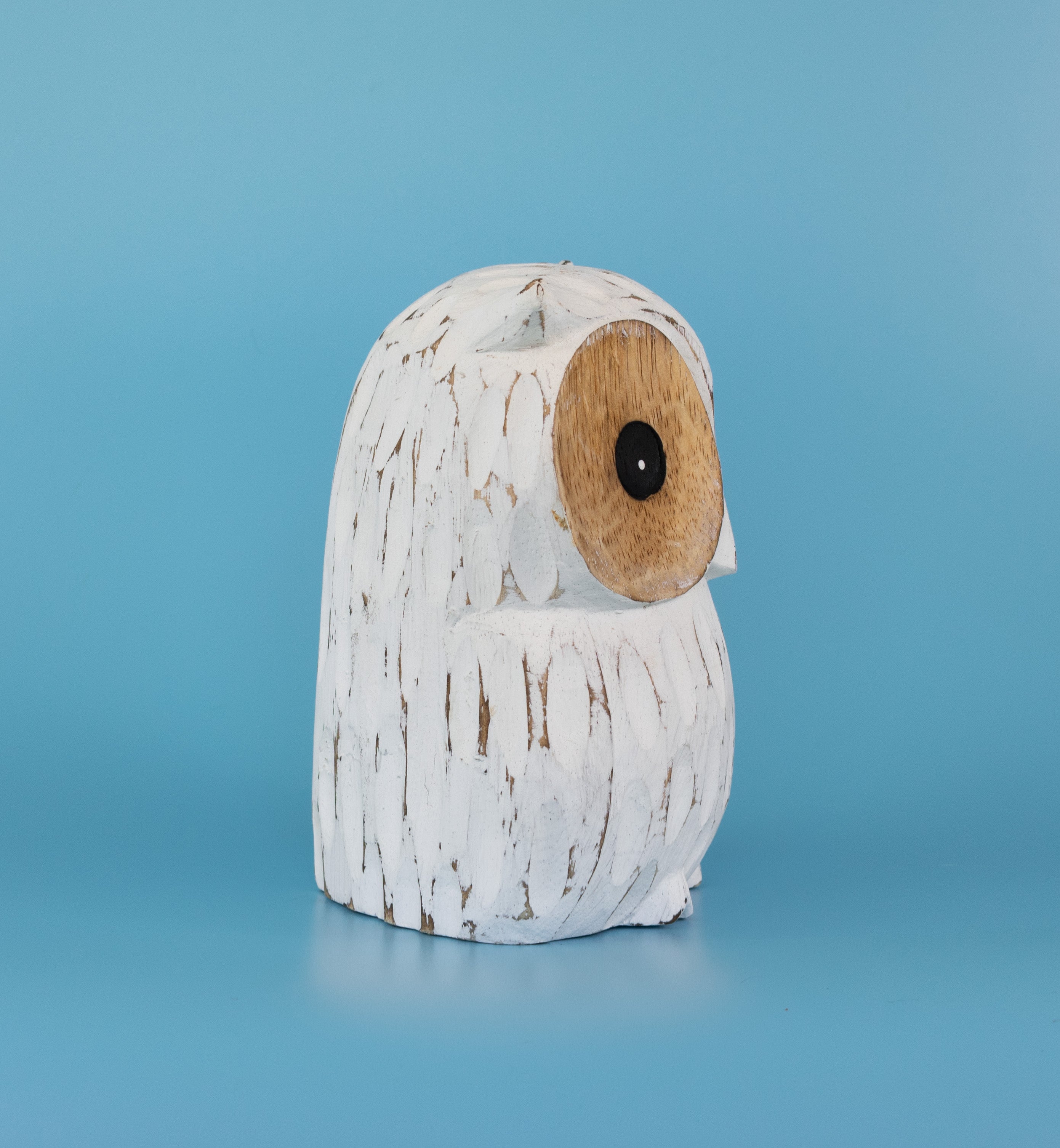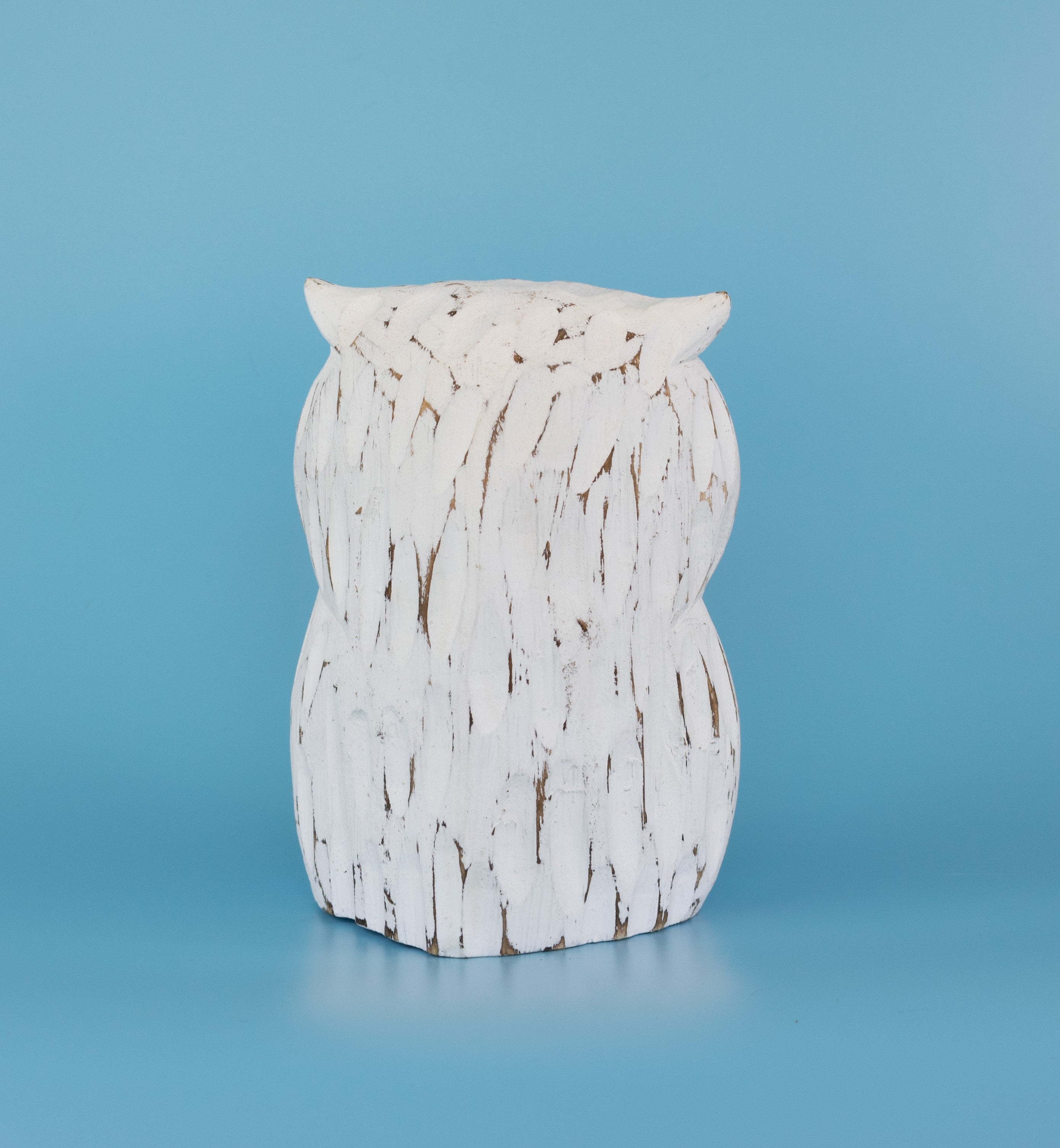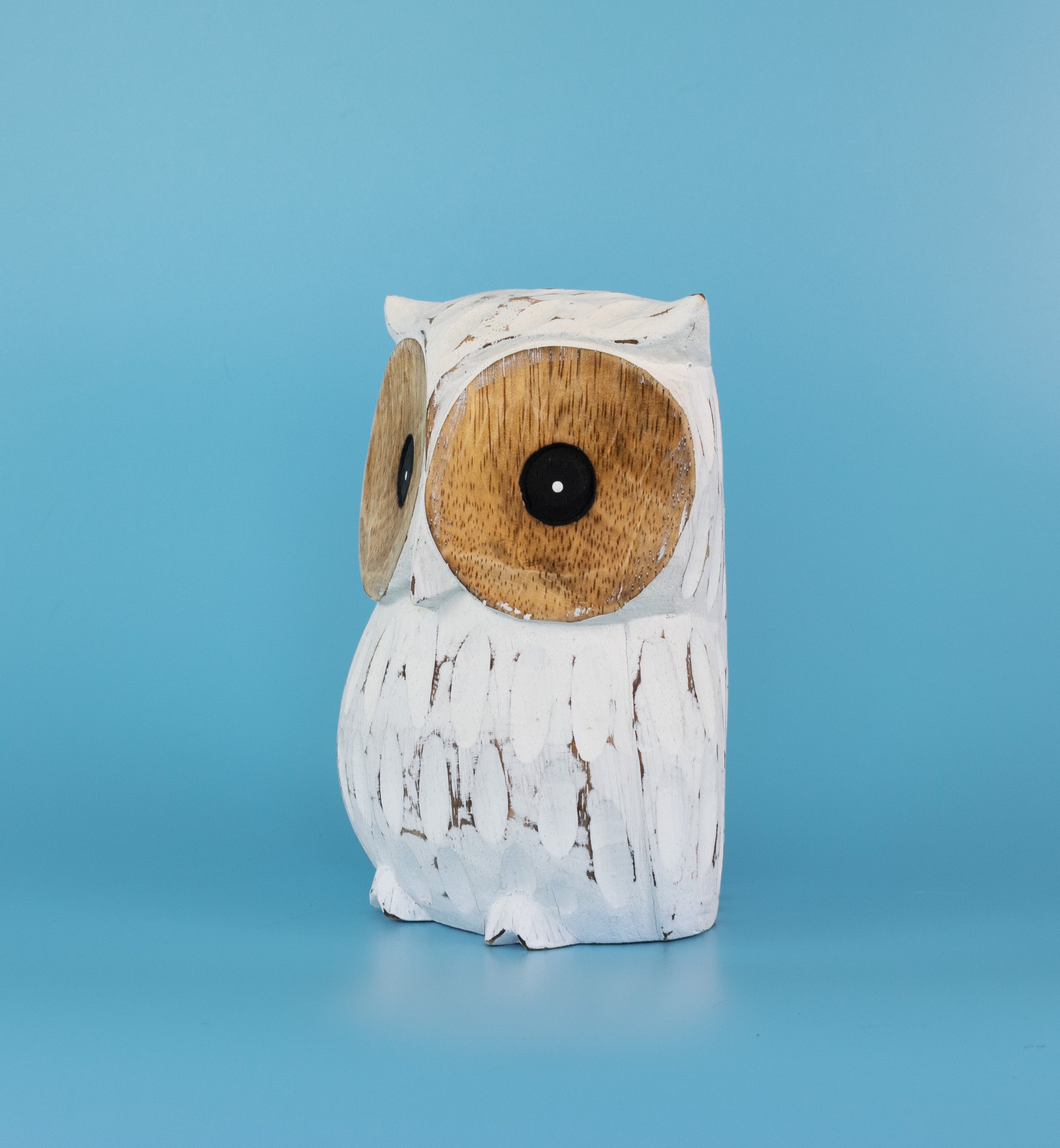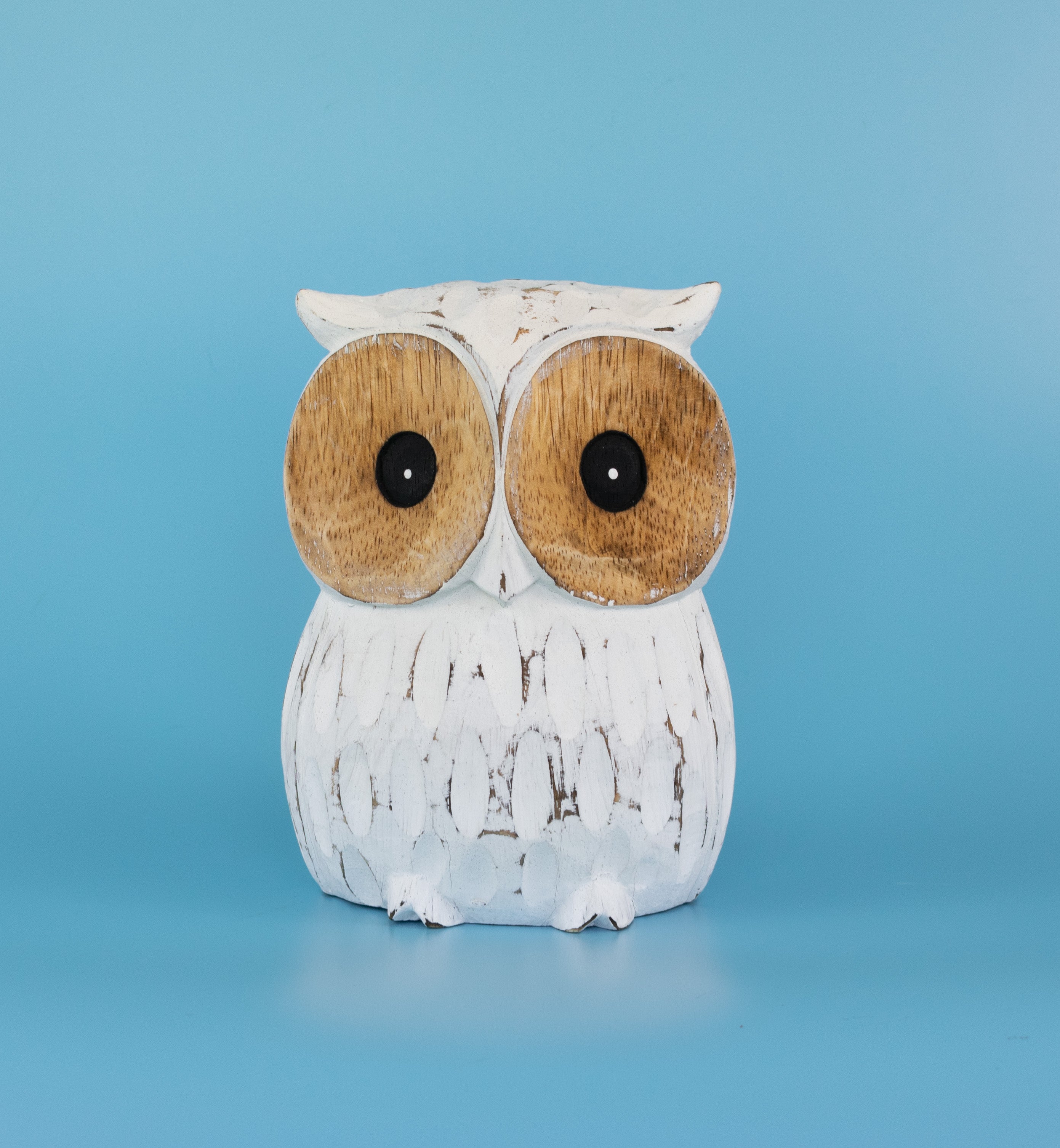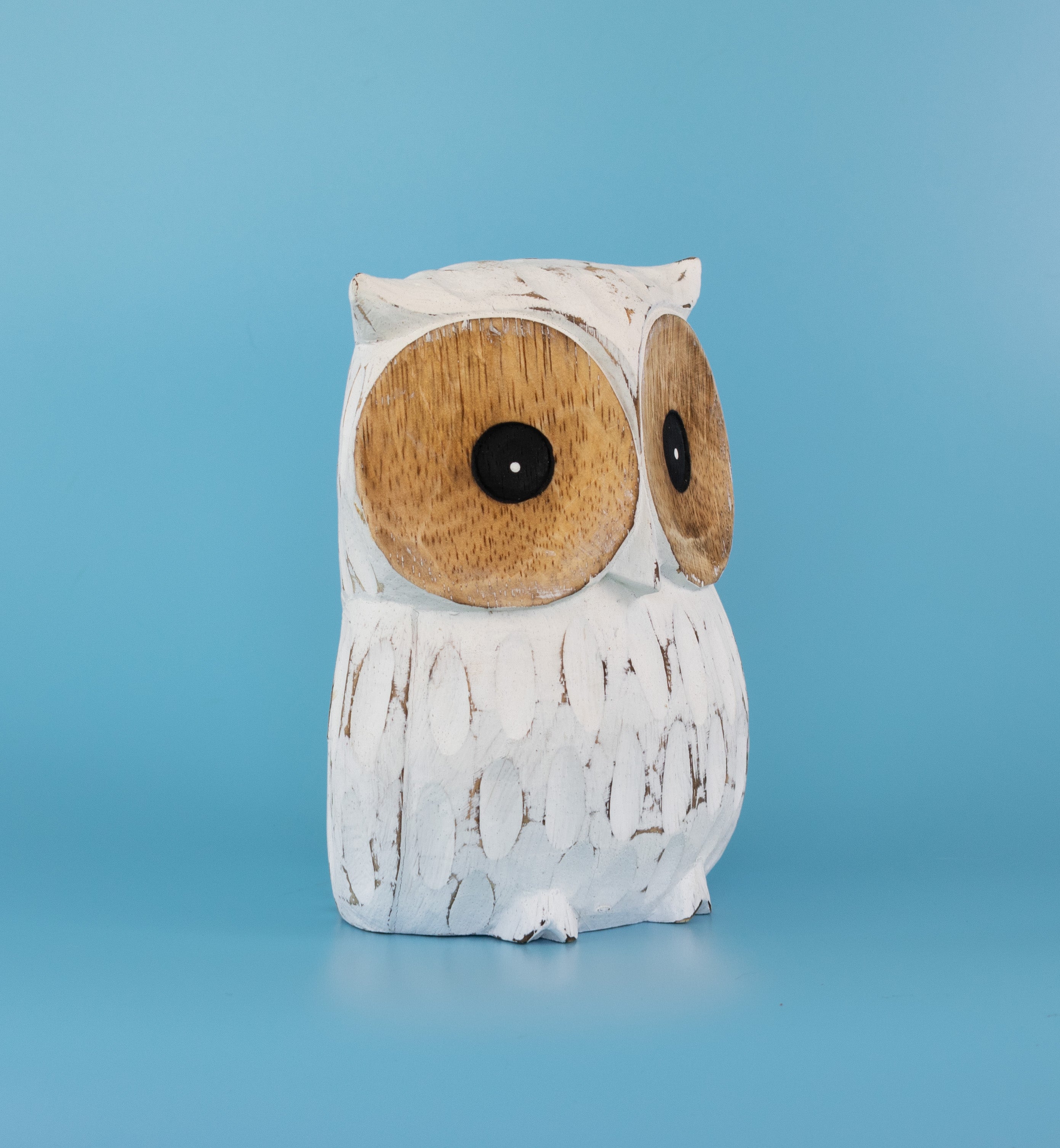 Who do you know that loves owls? If you do, this hand-made wooden owl is for you! Featuring white-washed albizia wood, this wide-eyed owl can gaze over your favorite rooms. Each carving is original thanks to the unique detailing of the wood, making it a splendid choice for nature-lovers.