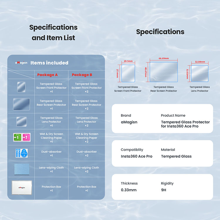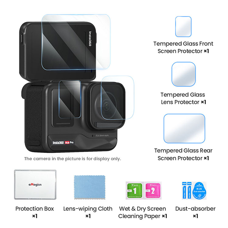 l 1x Tempered Glass Front Screen Protector, 1x Tempered Glass Lens Protector, 1x Tempered Glass Rear Screen Protector, 1x Lens-wiping Cloth, 1x Dust-absorber, 1x Protection Box, 1x Wet and Dry Screen Cleaning Paper