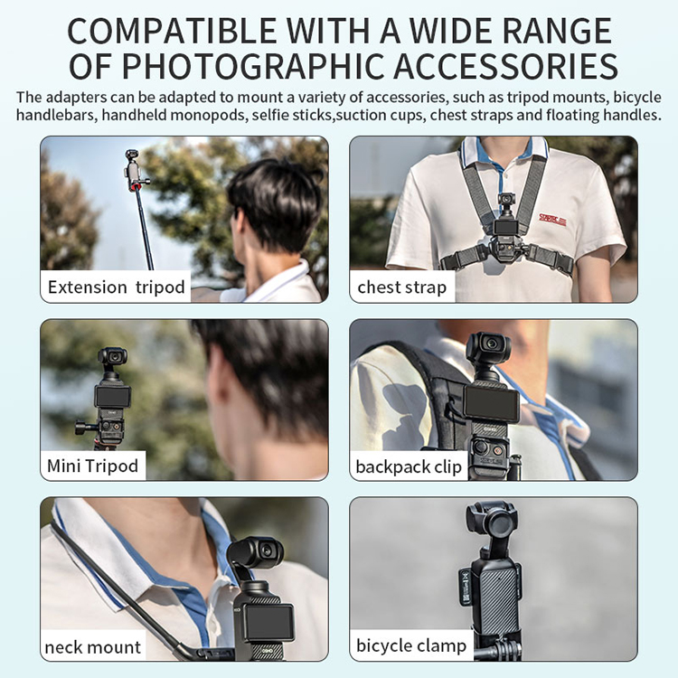 The adapter can be adapted to install a variety of accessories, such as tripod mounts, bicycle handlebars, handheld monopods, selfie sticks, suction cups, chest straps and floating handles
