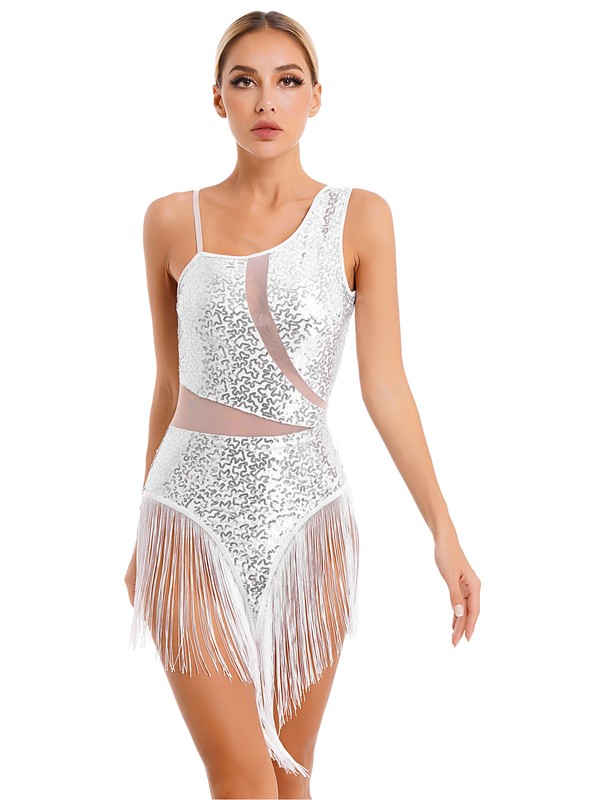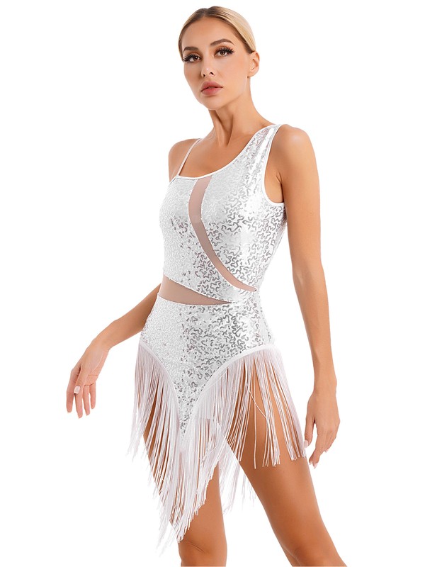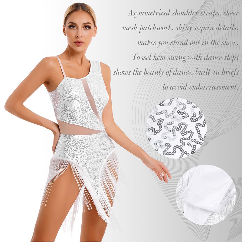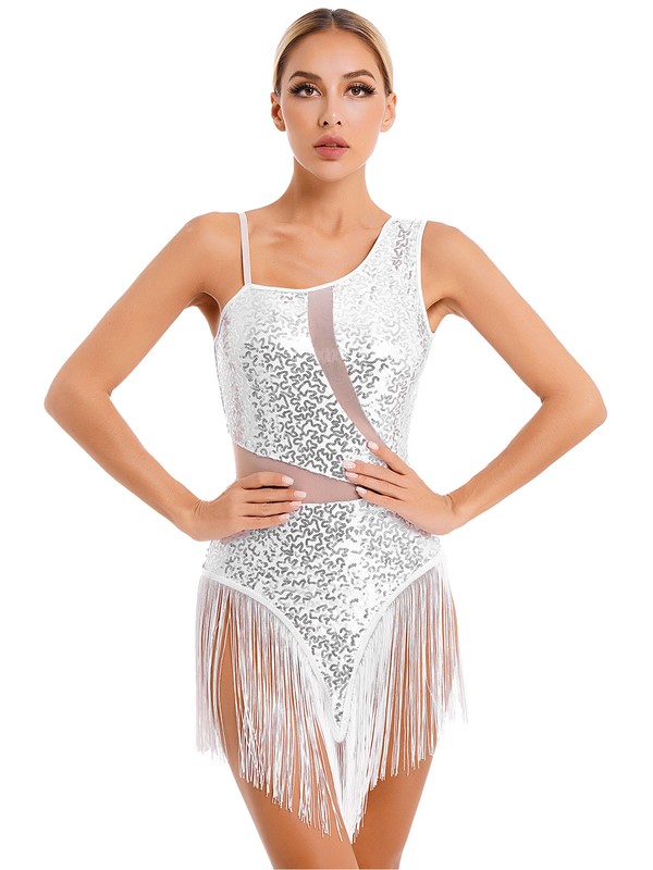 Womens Sparkling Sequins Fringed Leotard Cross Back Bodysuit Dancewear.