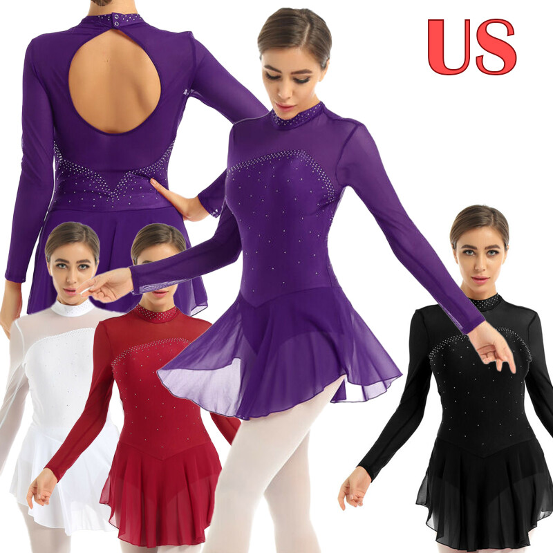 Women V Neck Rhinestone Dance Dress Figure Skating Skirted Leotard Gymnastics Dresses.
