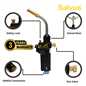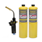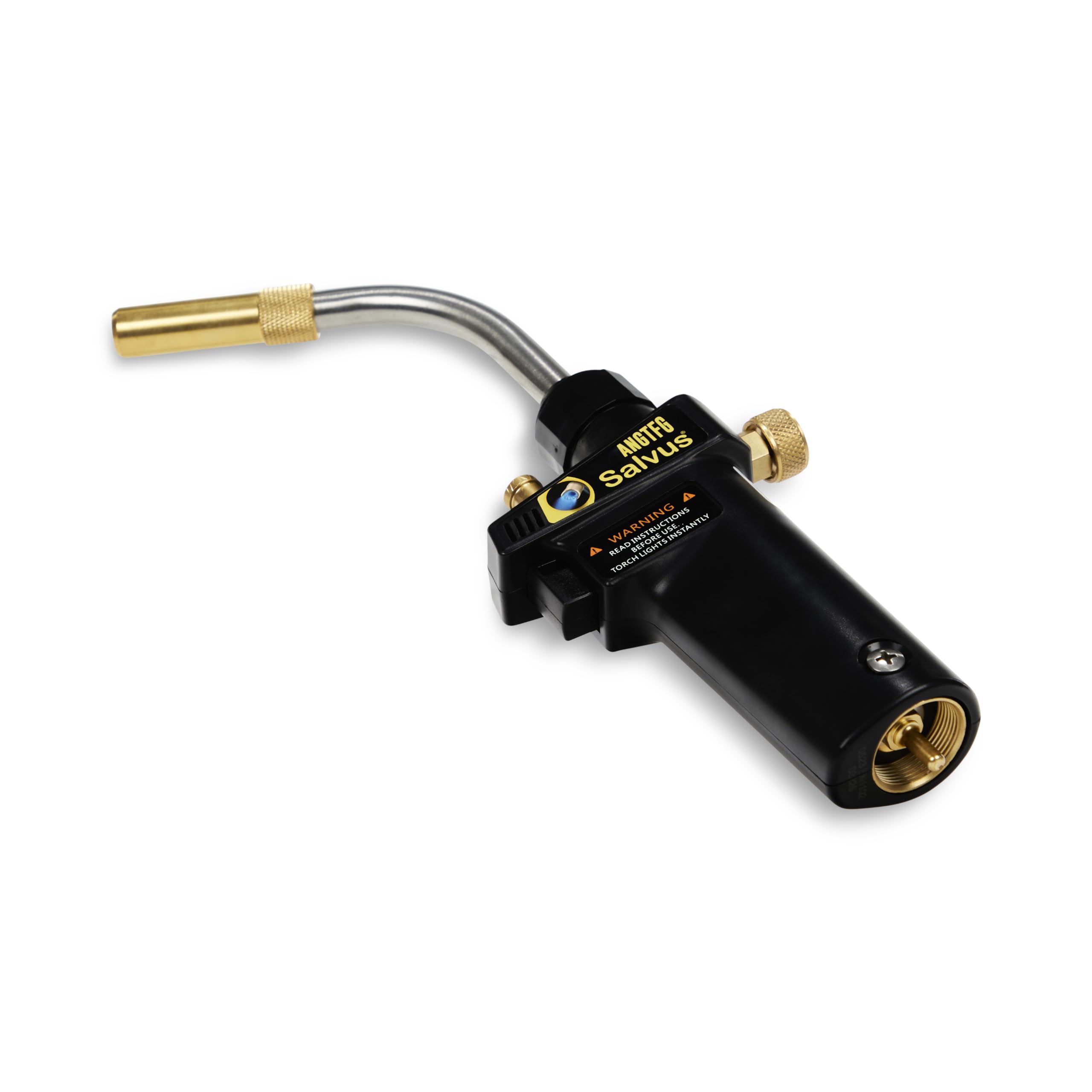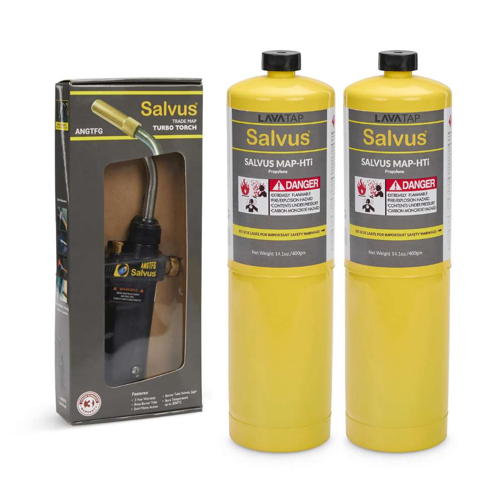Plumbing blowtorch kit consisting of a Salvus Turbo Torch with a CGA600 connection suitable for Propane and Map style gases, a 360 swivel tip, high-intensity swirl flame, adjustable flame, comfortable blow torch handle design, Piezo ignition, quick locking tip connection, lockable gun trigger and replaceable tip; perfect for the professional or DIYer. Also included is 2 x 400g bottles of Salvus Mapp gas which burns at upto 3600F, much higher than propane and higher than most other map gases. This is a great kit for those wishing to braze, solder or release seized nuts and bolts with heat. Salvus MAP-HTi is an extremely flammable gas Warning:- May displace oxygen and cause rapid suffocation. Contains gas under pressure which may explode if heated.