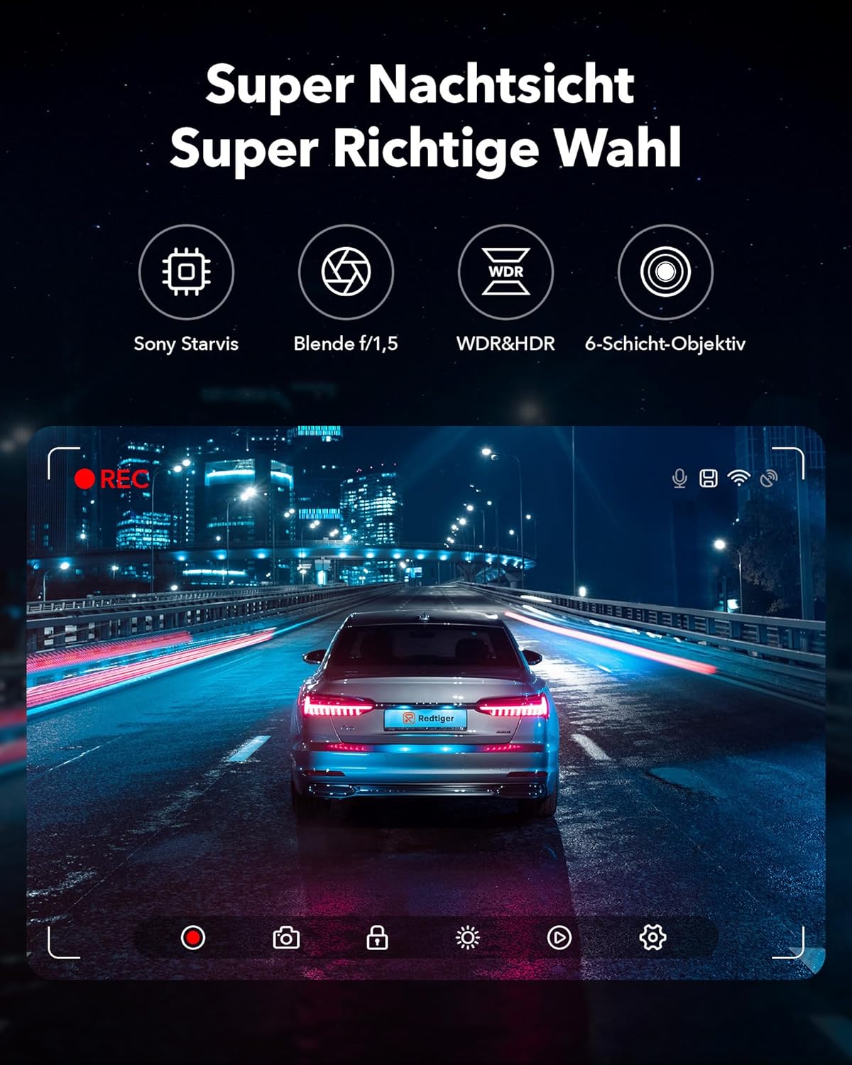 ÜBERLEGENE NACHTSICHT – Der Fahrrekorder verfügt über ein hervorragendes optisches Objektiv mit einer extrem großen F1,5-Blende und 6 Schichten und ist mit HDR/WDR-Technologie ausgestattet, um wichtige Details auch bei schlechten Lichtverhältnissen klar zu erfassen.