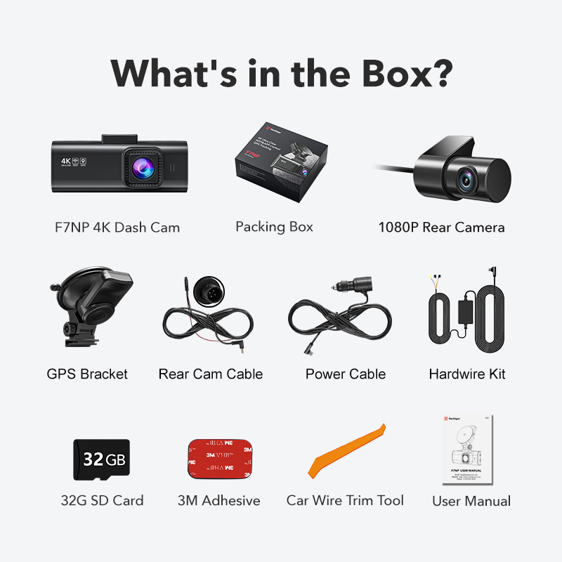 Diese Dashcam unterstützt SD-Karten mit 32 GB bis 256 GB. Eine kostenlose 32-GB-Karte ist im Paket enthalten. Wenn Sie eine neue U3-SD-Karte der Klasse 10 kaufen müssen, empfehlen wir Ihnen die Verwendung einer 128-GB-SD-Karte von Redtiger im Laden, die am besten geeignet ist.