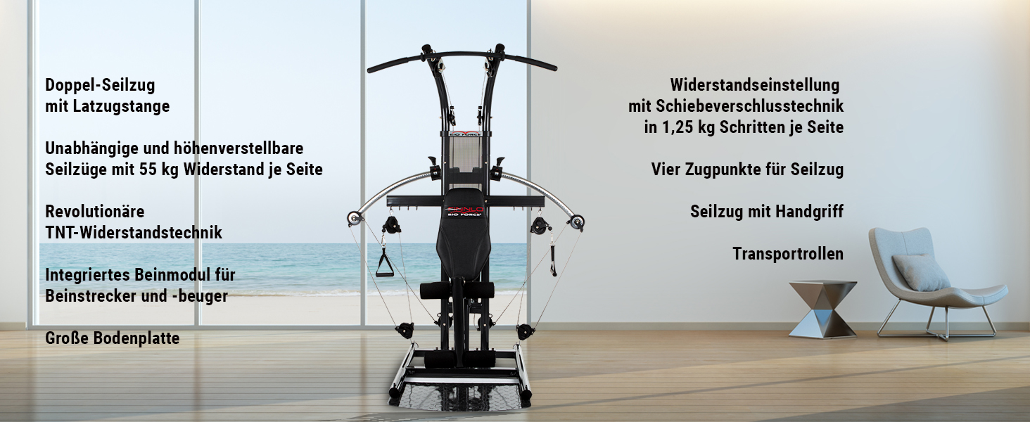Der Widerstand bei der Bio Force Kraftstation wird dabei nicht über Gewichtsscheiben, sondern über einen Druckzylinder vermittelt. Diese aus der Raumfahrt stammende TNT-Technologie spart nicht nur Gewicht (die Bio Force wiegt nur 66 kg), sondern ermöglicht ein beinahe geräuschloses Training. Der Gesamtwiderstand reicht bis zu 55 kg pro Seite, die entweder unabhängig voneinander oder kombiniert mit bis zu 110 kg verwendet werden können.