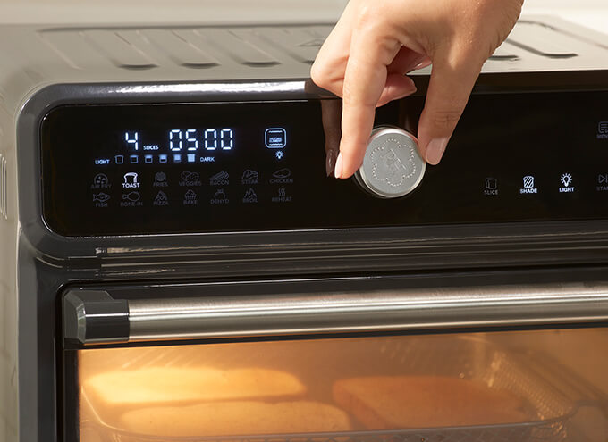 Sleek, easy-to-use design and display featuring convenient settings with time and temperature defaults for 8 commonly cooked foods (including preheat time where applicable) as well as 6 cooking methods.