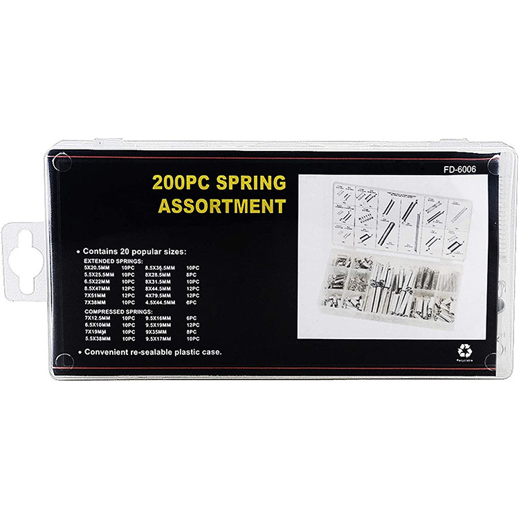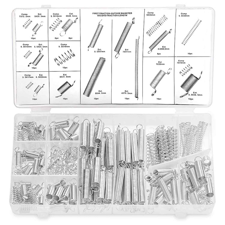 l Tension Spring: 5*10=10pcs, 5.5*14=10pcs, 6*10=10pcs, 8*13=8pcs, 7.5*17=10pcs, 8.5*26=12pcs, 8*50=12pcs 7*55=12pcs, 4*70=12pcs, 5*34=8pcs, 7*25=10pcs, 8*23=10pcs