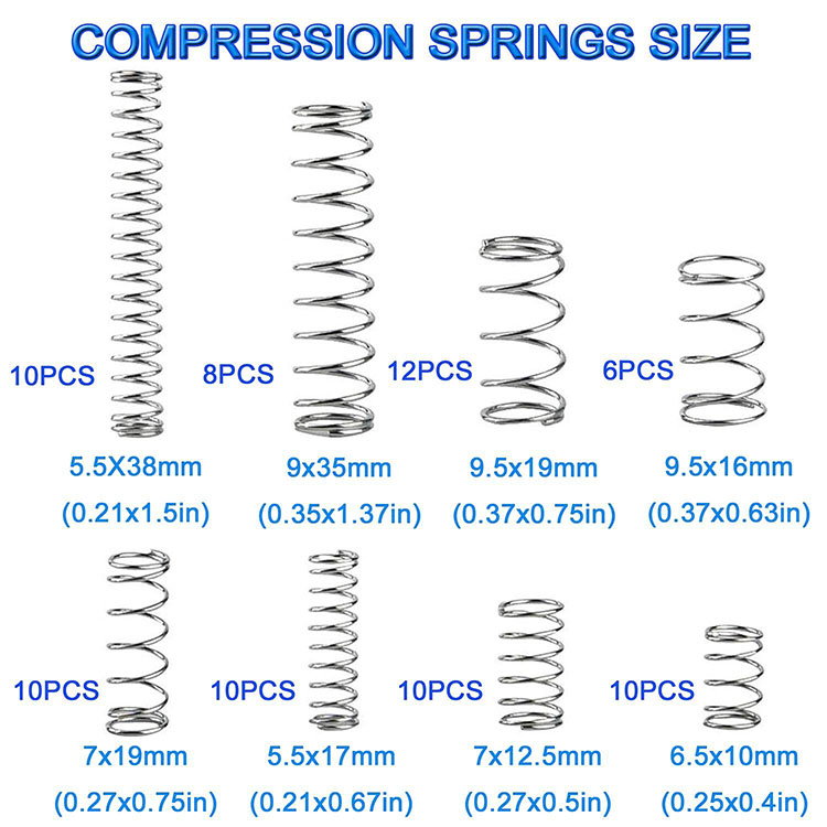 l Compression Spring: 7*13=10pcs, 6*12=pcs, 5.5*27=10pcs, 9.5*16=6pcs, 9*18=12pcs, 9*35=8pcs, 5.5*38=10pcs, 7*19=10pcs