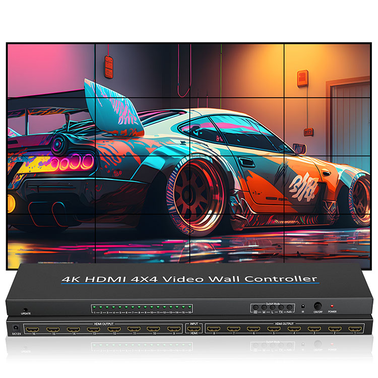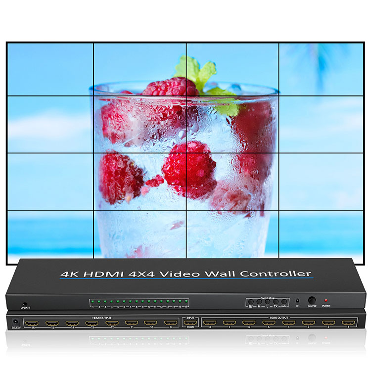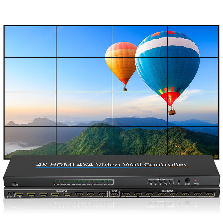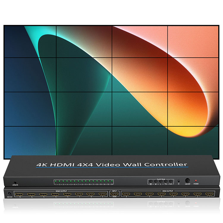 This 4X4 Splicer supports 1 HDMI input and 16 HDMI output. The main function of the Splicer is to divide a full HDMI image into 16 blocks and distribute them to 16 video displays, complete with 16 HDMI HD video display units to form a large dynamic image screen. Supports multiple splicing modes, supports cascading