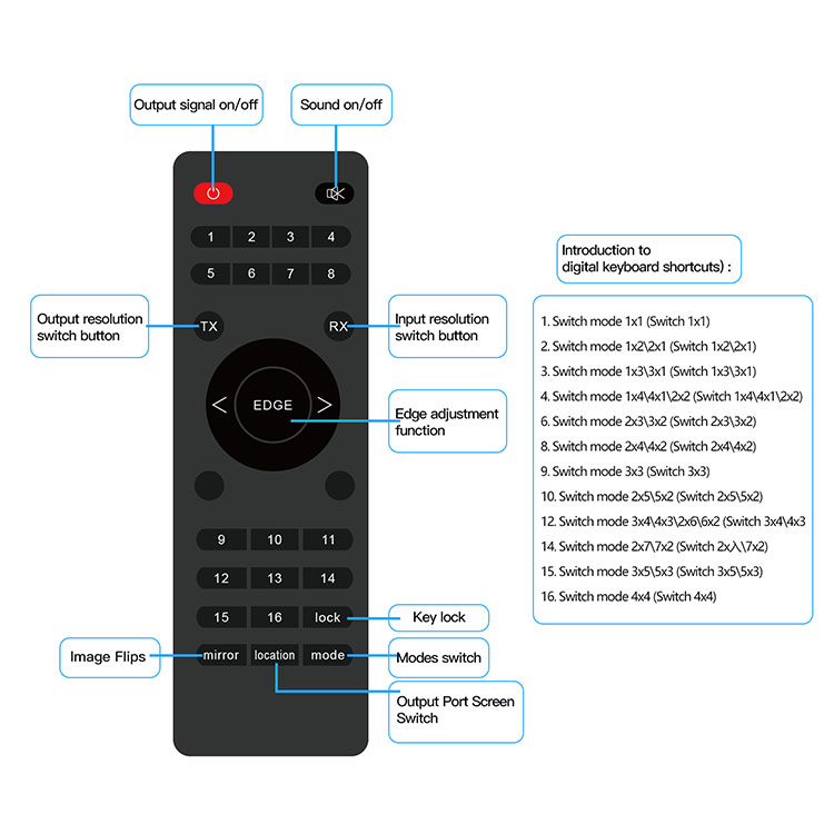 Switch the output port screen: first, press the remote control“Location” button, wait for the OSD in the upper left corner of the screen to show“Location”; second, use the digital keys to operate, for example, you want to select the 6th screen output, you press the number“6” button. When you're done, remember to press the“Location” button again to exit the operation