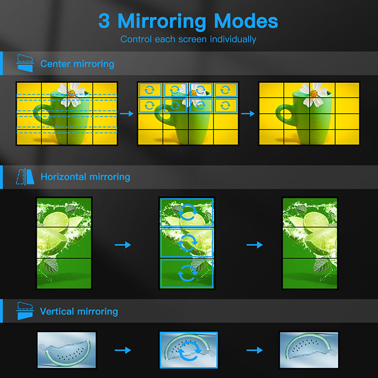 The use of image flipping (each image can be flipped independently) : Step 1, press the remote control“Mirror” button, wait for the OSD in the upper left corner of the image to display“Mirror”; Step 2, use the number button to operate, for example, you want to flip the sixth screen, you press the number“6” button. When you're done, remember to press the“Mirror” button again to exit the operation
