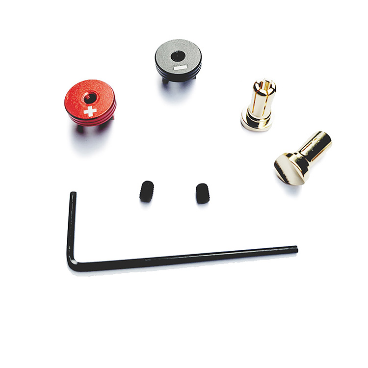 1x Red Aluminium Positive Heat Sink Connector, 1x Black Aluminium Negative Heat Sink Connector, 1x Plug, 2x Screw