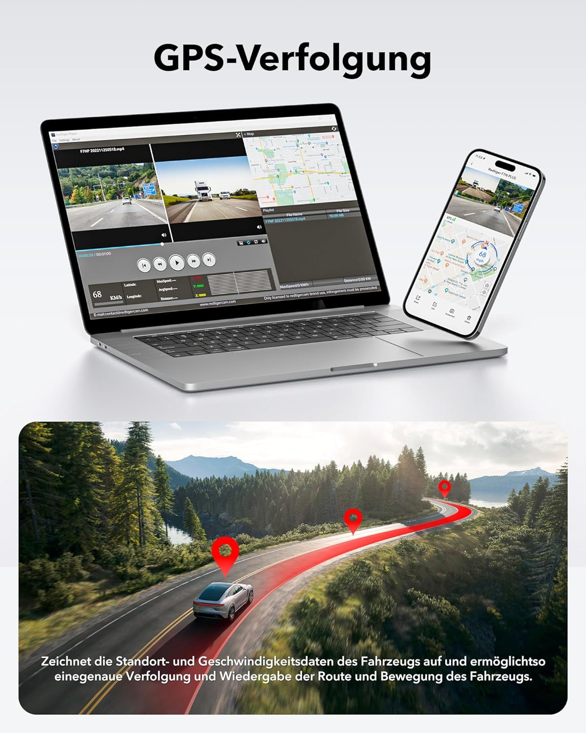 DASH-CAM MIT GPS – Diese Dash-Cam verfügt über ein integriertes GPS und zeichnet die Fahrtroute, die Geschwindigkeit in Echtzeit, den Standort usw. auf. Sie können die Verfolgung auf Google Maps über WLAN mit der App oder mit unserem Windows- und Mac-GPS-Player durchführen im Falle eines Unfalls weitere zusätzliche Beweise erbringen.