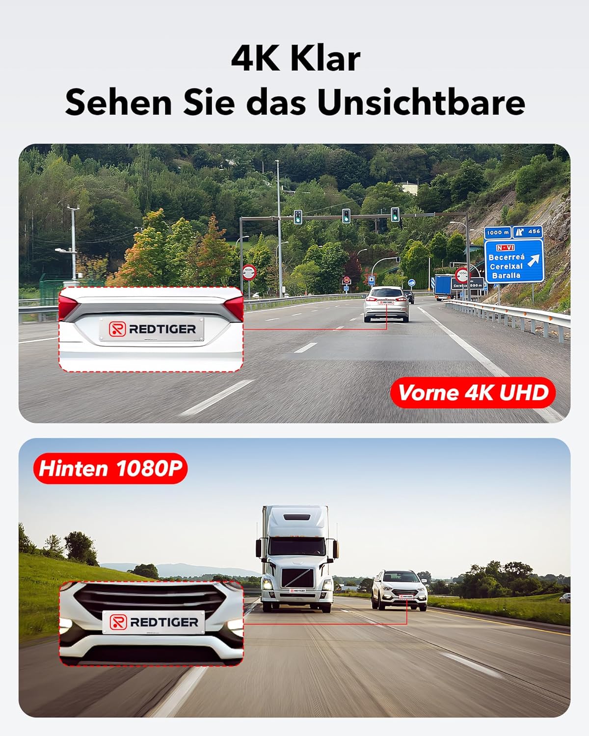 4K+1080P DUAL-AUFZEICHNUNG - REDTIGER bietet Ihnen die F7NP Dual-Dashcam, die Videos mit einer Auflösung von bis zu Ultra HD 4K (3840*2160P) + FHD 1080P aufzeichnet. Sie hilft Ihnen, wichtige Details wie Verkehrsschilder, Fahrzeugnummernschilder usw. zu lesen. Zur Reduzierung der toten Bereiche verfügt es über einen vorderen Weitwinkel von 170 Grad und einen hinteren Weitwinkel von 140 Grad. Dies hilft Ihnen, in unerwarteten Situationen wie einer Kollision Beweise zu sichern und vorzulegen.