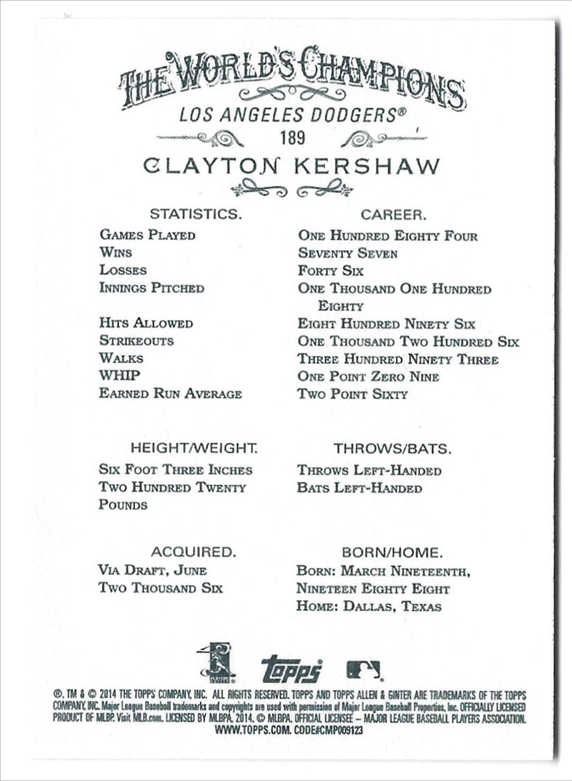 | 2014 Topps Allen & Ginter Clayton Kershaw #189 **READ&SAVE** Los Angeles Dodgers | ||||||||||||||||||
